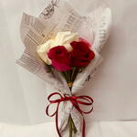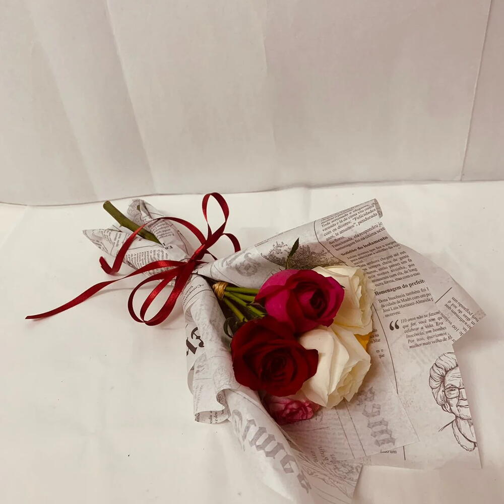 laço em cetim - 1 un. embalagem flower jornal - 1 un. rosa vermelhas (verificar disponibilidade) - 3 un. rosa brancas (verificar disponibilidade) - 3 un.