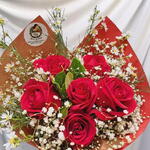 Celebre os momentos especiais com este requintado buquê! Composto por 6 luxuosas rosas vermelhas, cuidadosamente selecionadas e acentuadas por uma elegante folhagem, o buquê é habilmente arranjado e embalado em uma exclusiva embalagem de designer. Um laço delicado adiciona um toque final, elevando a sofisticação. Esse buquê é perfeito para expressar seu amor, admiração ou apreço em qualquer ocasião.