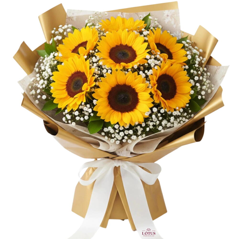 Ilumine o dia, ilumine sorrisos, ilumine a vida! Ilumine tudo ao seu redor com esse maravilhoso buquê de 6 Girassóis, delicadamente ornamentado para presente. Ficha Técnica Flores Tipo: Girassol Quantidade: 7 Informações Adicionais: Flores naturais de alta qualidade e cuidadosamente selecionada para garantir frescor, perfume e duração. Todos os nossos produtos são finalizados com papel celofane e fita de cetim. Cuidados e Recomendações: Conservar as flores em um vaso com água em local fresco e arejado. Para maior durabilidade das flores, troque a água a cada dois dias.
