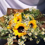 Buquê exuberante com 7 girassóis radiantes naturais, folhagens variadas, embalagem premium e laço. Um buquê que ilumina qualquer ambiente