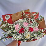 embalagem personalizada - 1 un. rosa coloridas - 9 un. laço decorativo - 1 un. folhagens variadas - 1 un.