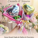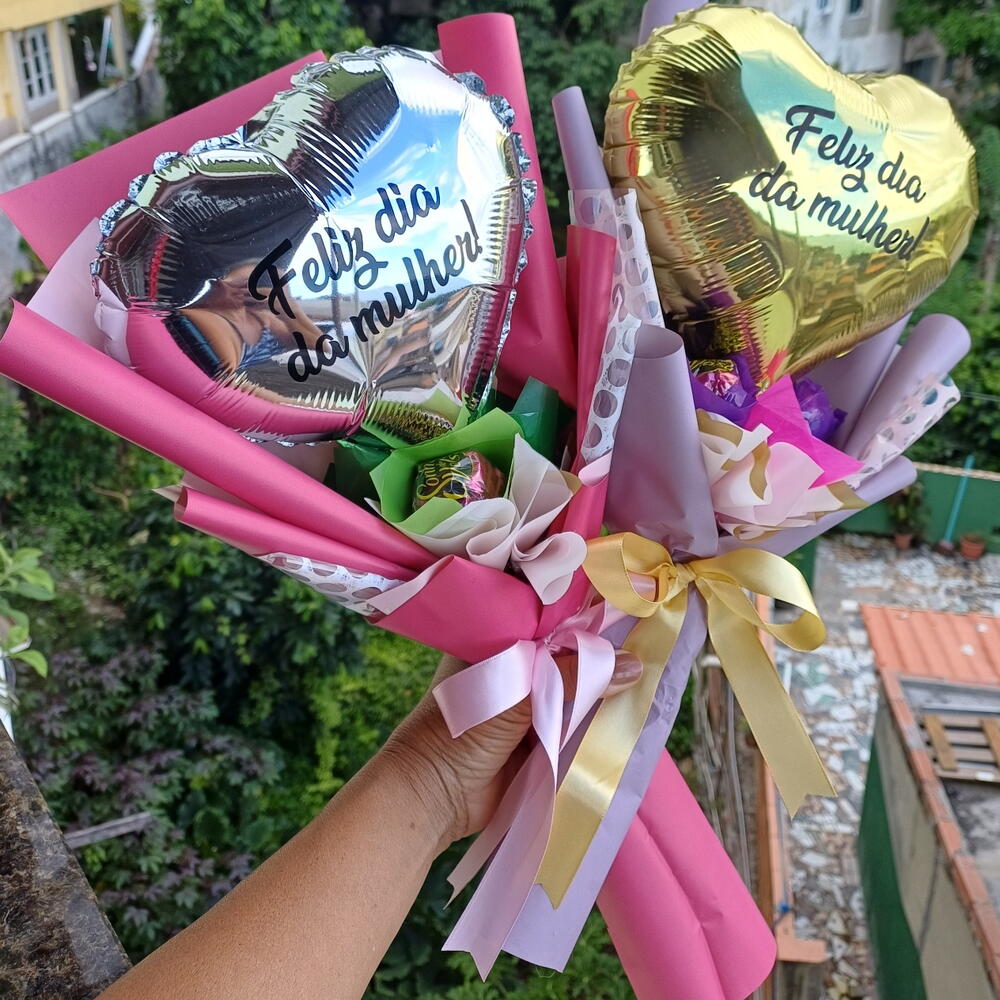 Buquê com Balão metalizado adesivado frase FELIZ DIA DA MULHER, com 03 Bombons Ouro Branco e Sonho de Valsa, muito bem embalados com Papel Poli