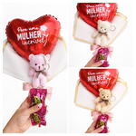 embalagem - 1 un. chocolates sonho de valsa - 2 un. ursinho chaveiro 11cm - 1 un. balão de coração personalizado - 1 un. sacola presenteavel - 1 un.