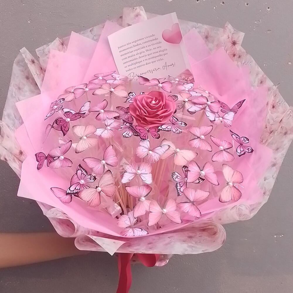 Este buquê encantador é composto por 35 unidades de borboletas, adicionando um toque mágico e delicado. A singularidade desse buquê é acentuada pela presença de uma rosa de cetim, simbolizando o amor e a sofisticação. Além disso, o buquê é realçado por um cordão de fadas/LED, que emite uma luz suave e cintilante, acrescentando um elemento de surpresa e encantamento. Perfeito para ocasiões especiais, este buquê é garantia de surpreender e encantar a pessoa amada.