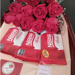 embalagem - 1 un. laço - 1 un. rosa vermelhas - 12 un. barras chocolate nestle - 3 un.