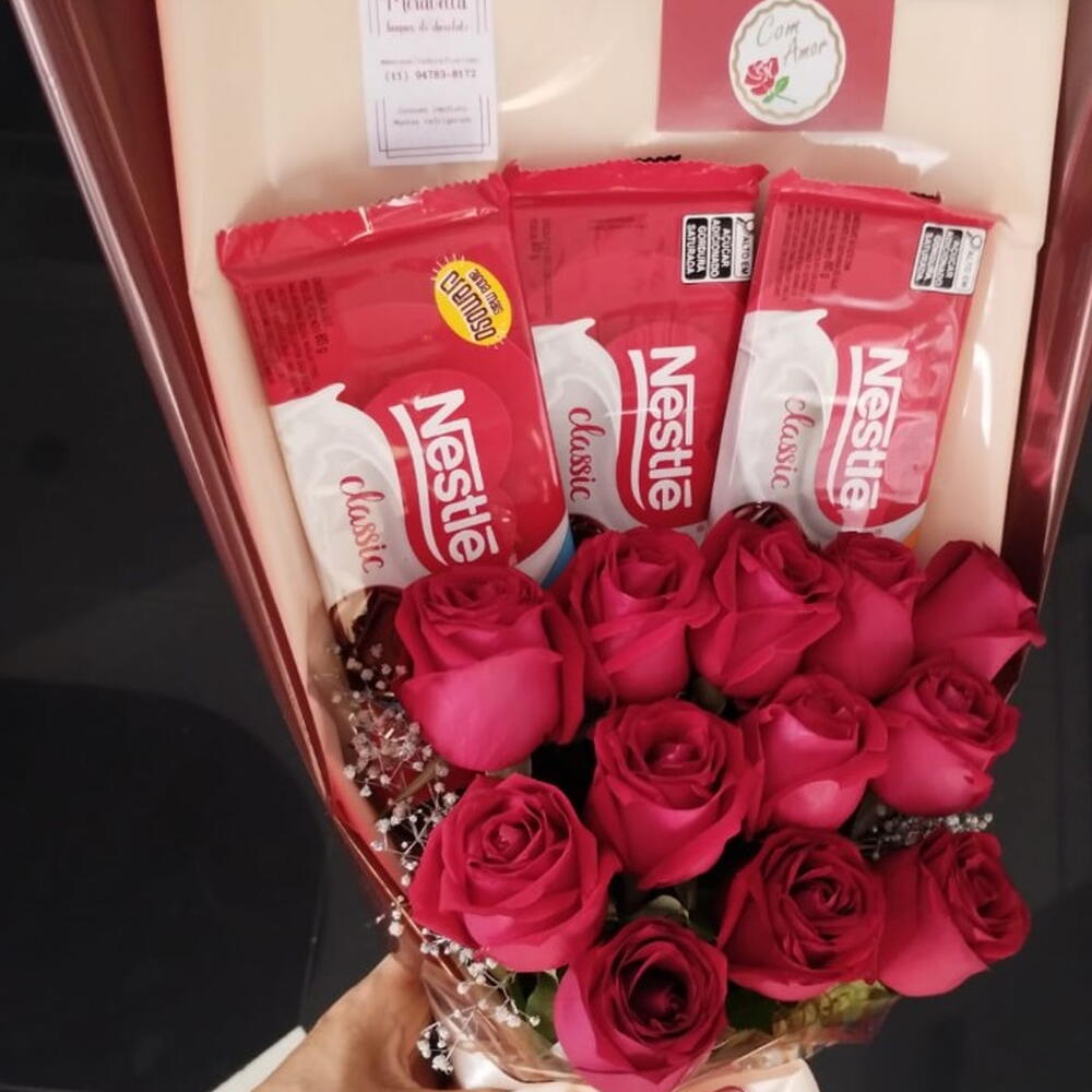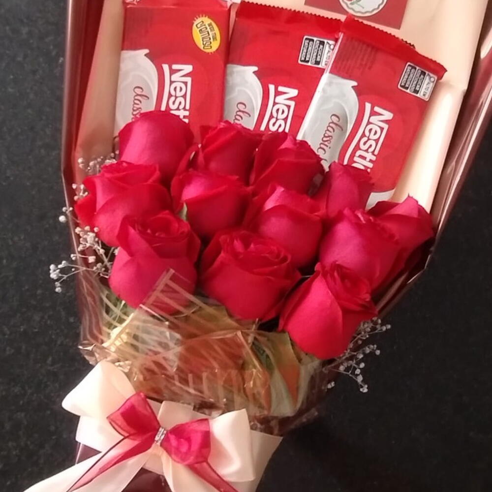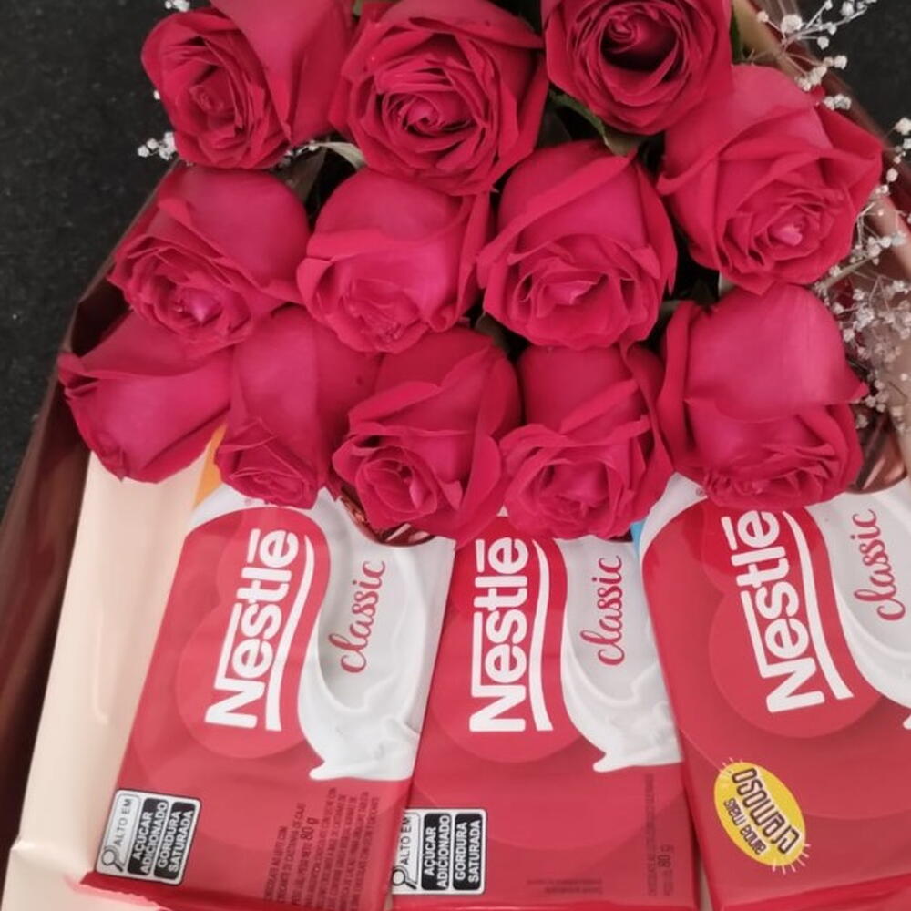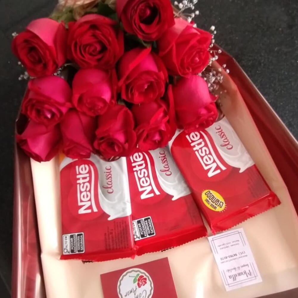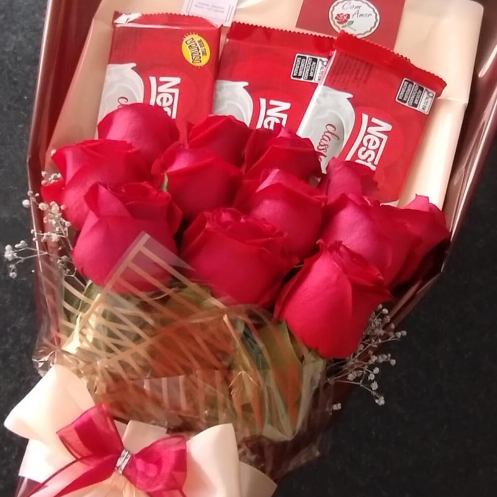 Este buquê sofisticado e encantador contém 12 belas rosas vermelhas, representando amor e paixão. Para complementar ainda mais, conta com 3 deliciosas barras de chocolate Nestle que prometem adoçar o dia de qualquer um. Tudo isso vem gentilmente organizado em uma embalagem elegante, destacada por um laço delicado. Ideal para um presente amoroso, aniversário ou simplesmente para mostrar o quanto você se importa.