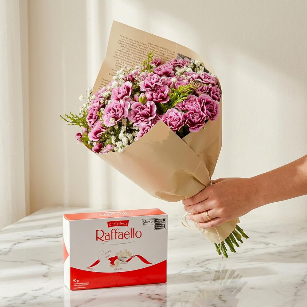 Este encantador presente com chocolate inclui um delicado buquê de 7 cravinas, artisticamente arranjadas e embaladas na perfeição. Além disso, tem um belo laço para adicionar um toque de elegância e celebridade ao presente. Para adoçar a oferta, uma caixa de Rafaello, conhecida pelo seu sabor irresistível, faz parte do presente. Este fabuloso conjunto é uma escolha incrível para demonstrar seu afeto em qualquer ocasião.