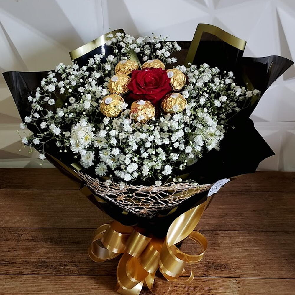 Este presente encantador composto por uma única rosa vermelha, perfeitamente acondicionada em uma embalagem bonita com um laço delicado, é um verdadeiro símbolo de amor e carinho. Acompanhando a rosa, você encontrará sete deliciosos bombons Ferrero Rocher, conhecidos pelo seu sabor único e inconfundível. Um presente doce, romântico e elegante, perfeito para todas as ocasiões. obs: Na ausencia da embalagem preta, poderá ser substituída por outra cor, mantendo a essência da decoração.