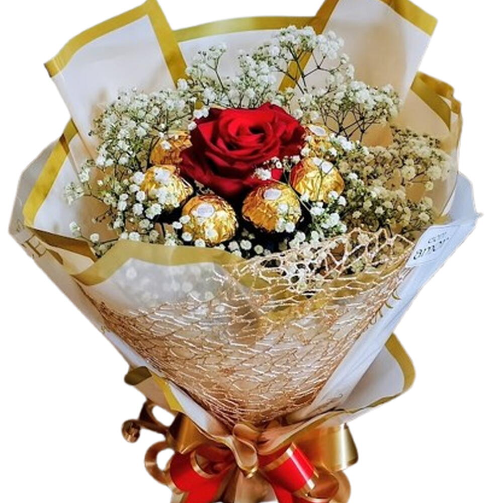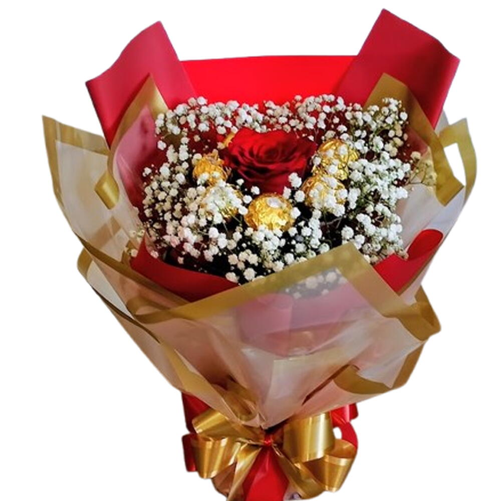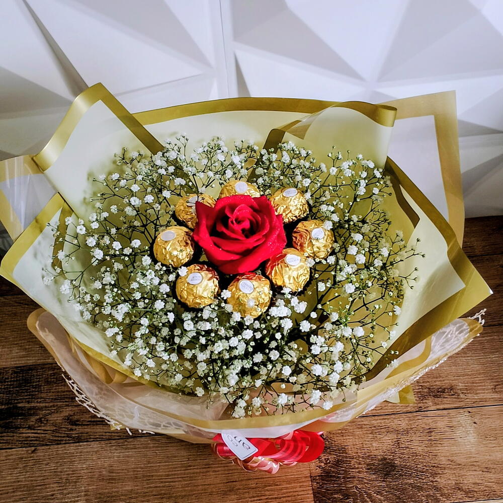 rosa vermelha - 1 un. embalagem - 1 un. laço - 1 un. bombom ferrero rocher - 7 un.