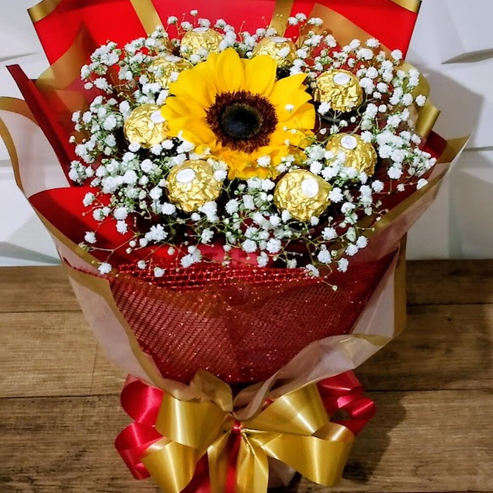 Encante com este buquê deslumbrante de girassol, rodeado por delicadas flores de mosquitinho e irresistíveis chocolates especiais. A combinação perfeita do vermelho e dourado traz sofisticação, paixão e elegância em cada detalhe. Um presente criativo e marcante para surpreender em qualquer ocasião especial.