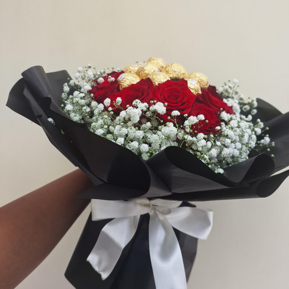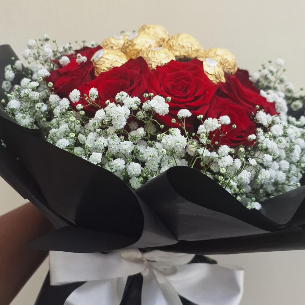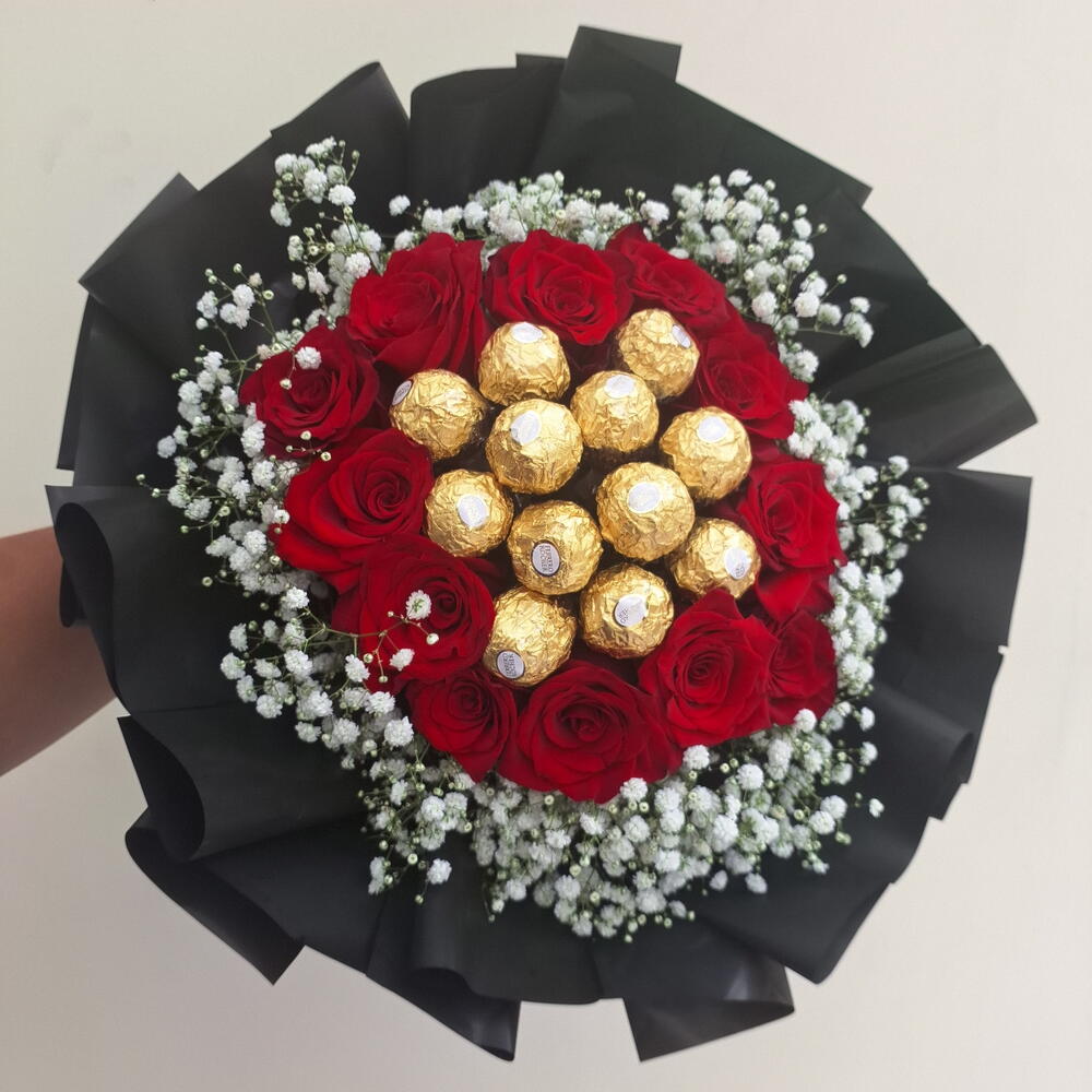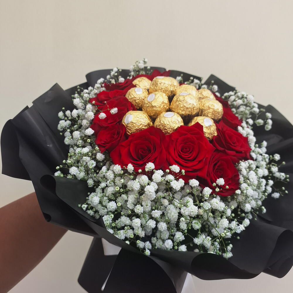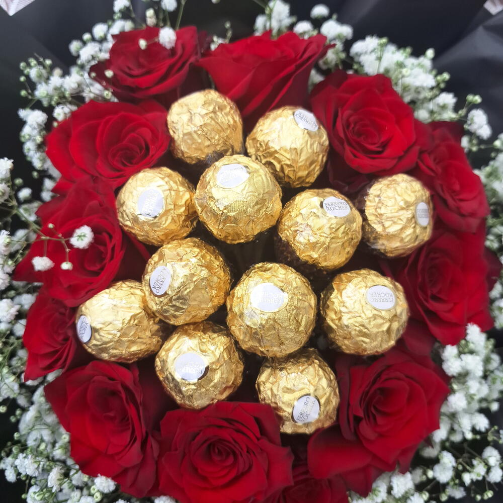 Este elegante buquê é uma combinação perfeita de luxo e romantismo. Composto por 10 exuberantes rosas e 12 chocolates Ferrero Rocher meticulosamente arranjados, é um presente perfeito para demonstrar amor e apreciação. As cores vibrantes das rosas complementam perfeitamente o chocolate dourado, criando um buquê visualmente atraente e deliciosamente indulgente. Ideal para aniversários, aniversários ou simplesmente para dizer eu te amo.