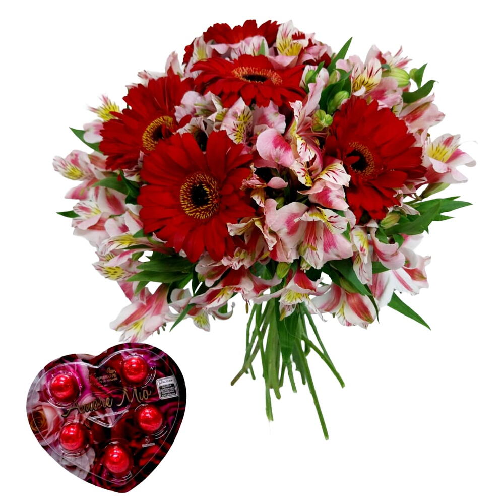 embalagem - 1 un. gérbera - 6 un. astromelias - 15 un. bombom viermon - 1 un.