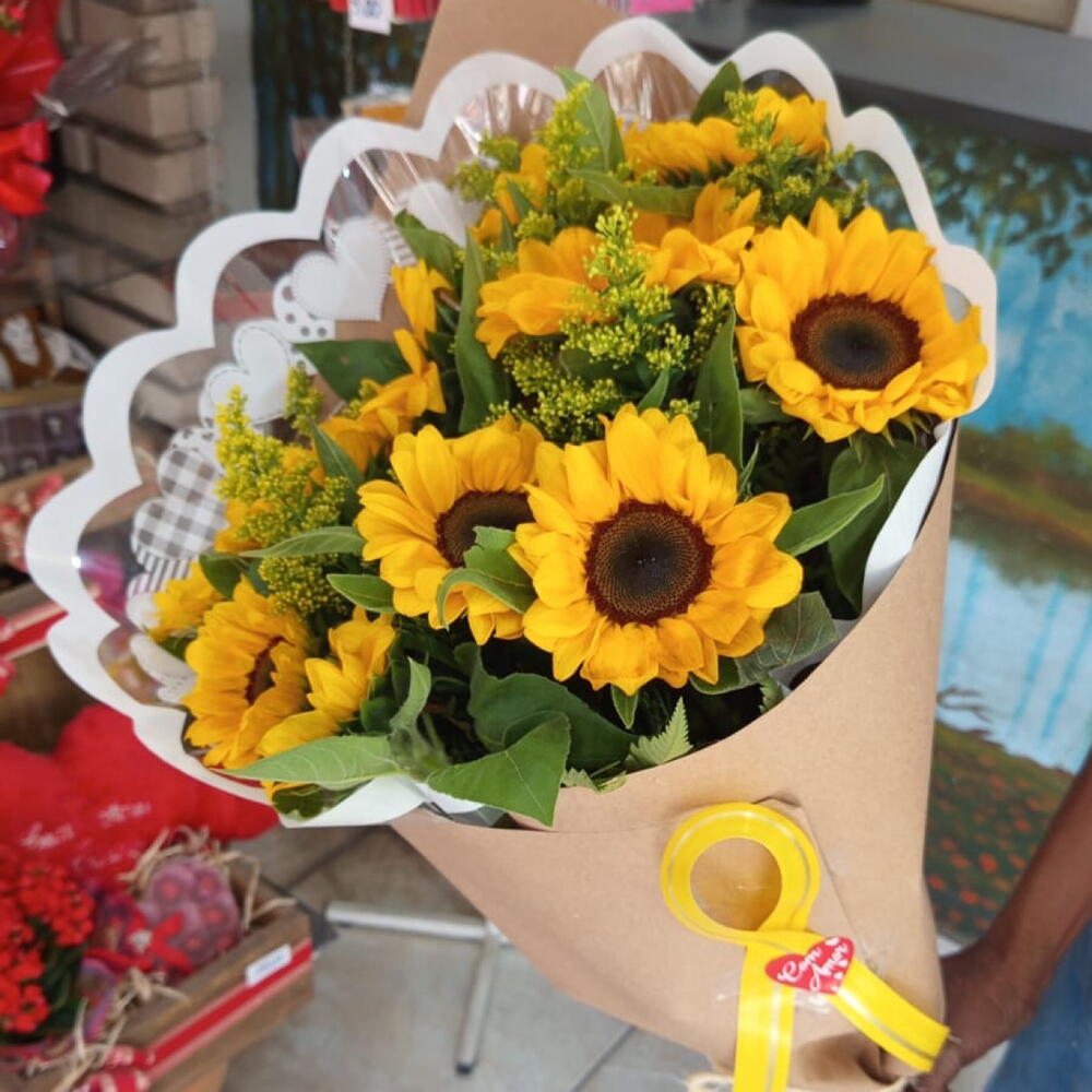 Encante-se com o nosso buquê de girassóis, composto por 12 unidades de flores frescas e radiantes. Este arranjo lindo e animado irá iluminar qualquer ambiente e proporcionará uma sensação de alegria e positividade. Perfeito para ocasiões especiais ou simplesmente para alegrar o seu dia a dia.