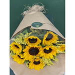 Descubra a alegria do sol em sua forma mais bela com este lindo buquê composto de sete girassóis radiantes, complementado por um toque de folhagem verde. Cuidadosamente embalado em papel kraft e celofane transparente para manter a sua frescura e apresentado com um laço de ráfia. Este buquê é a representação perfeita de gratidão, paixão e energia, fazendo do presente perfeito para qualquer ocasião.