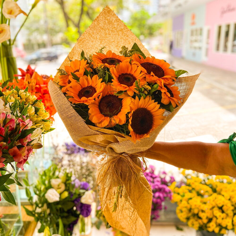 O Buquê de Girassóis é um símbolo de otimismo e vitalidade. Suas flores douradas e radiantes capturam a essência do sol e a energia positiva da natureza. É uma escolha perfeita para celebrar momentos felizes, transmitindo calor e alegria a quem o recebe. Um presente encantador que ilumina o dia de qualquer um.