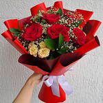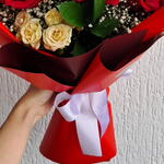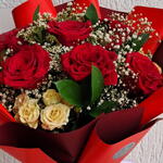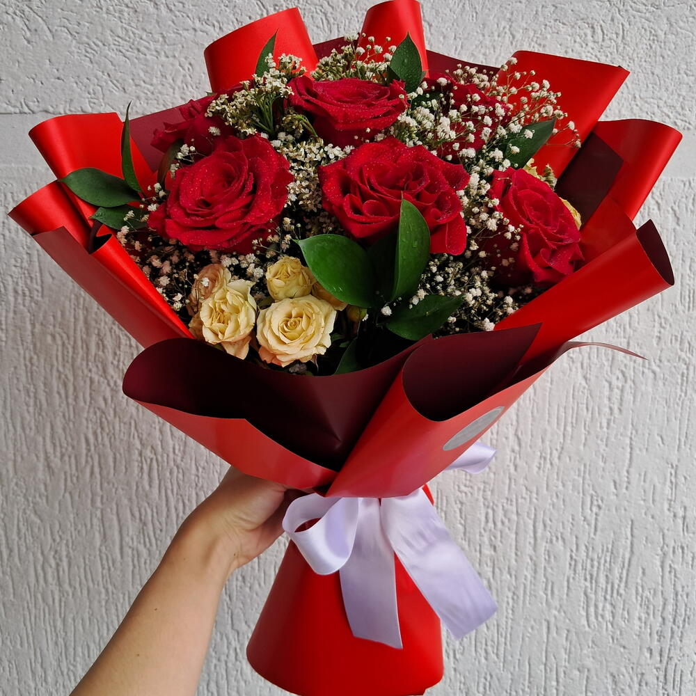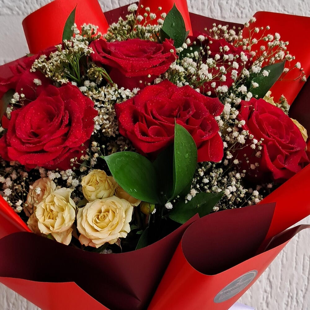 Composição delicada com 6 rosas vermelhas importadas, flores mistas e folhagens selecionadas. Embrulho em folhas de poli (cor escolhida pela florista, conforme disponibilidade) e finalização com laço de cetim. As flores são naturais e podem apresentar pequenas variações de tonalidade e formato, preservando sempre a harmonia e a qualidade do arranjo.