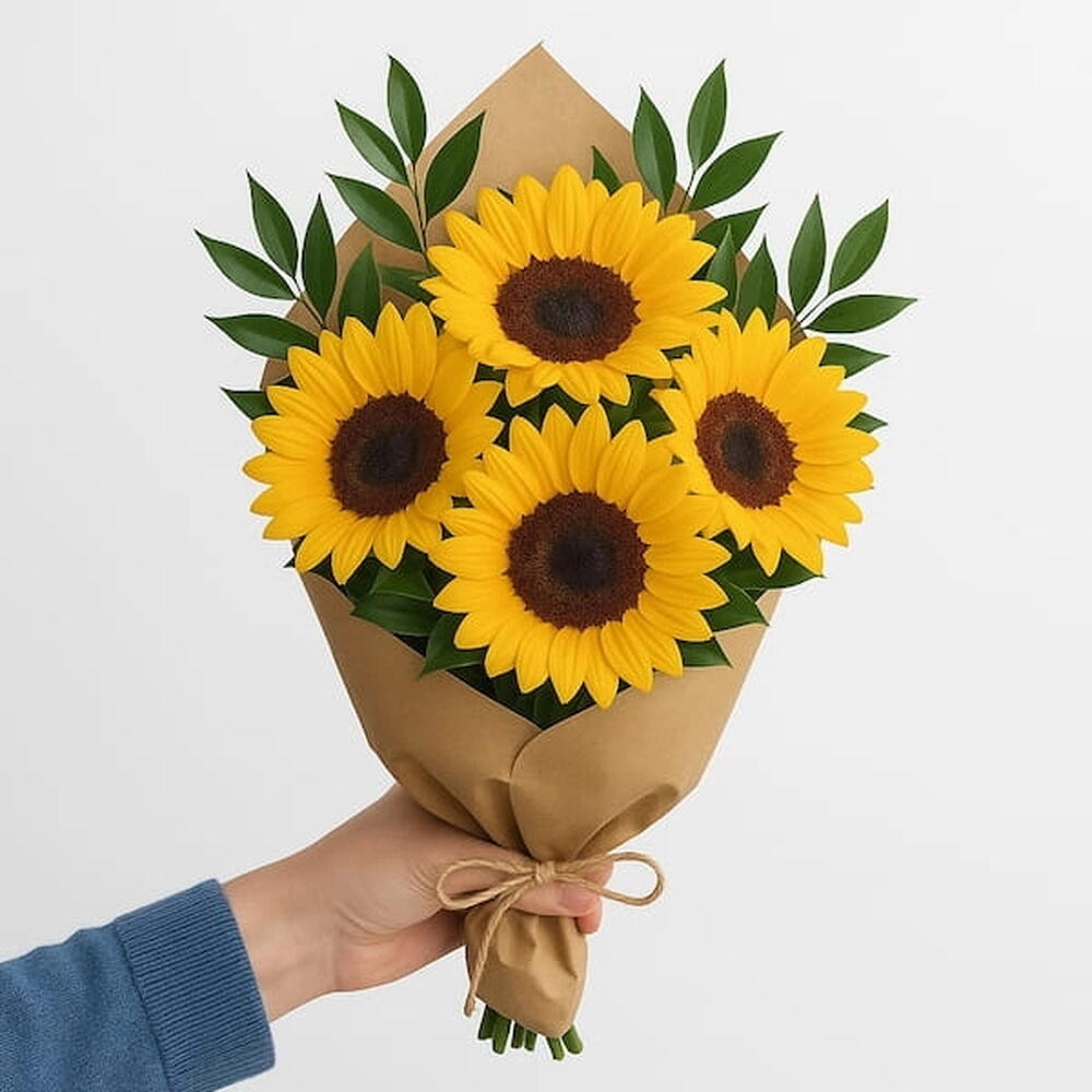 Este elegante buquê é composto por 4 radiantes girassóis, cuidadosamente arranjados e embrulhados em uma única unidade de papel kraft. A combinação das cores vibrantes dos girassóis com o rústico e elegante papel kraft torna este buquê uma opção perfeita para trazer alegria e calor para qualquer ocasião. Um toque de natureza que fará o dia de qualquer pessoa mais brilhante!