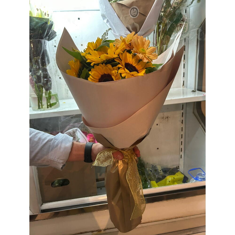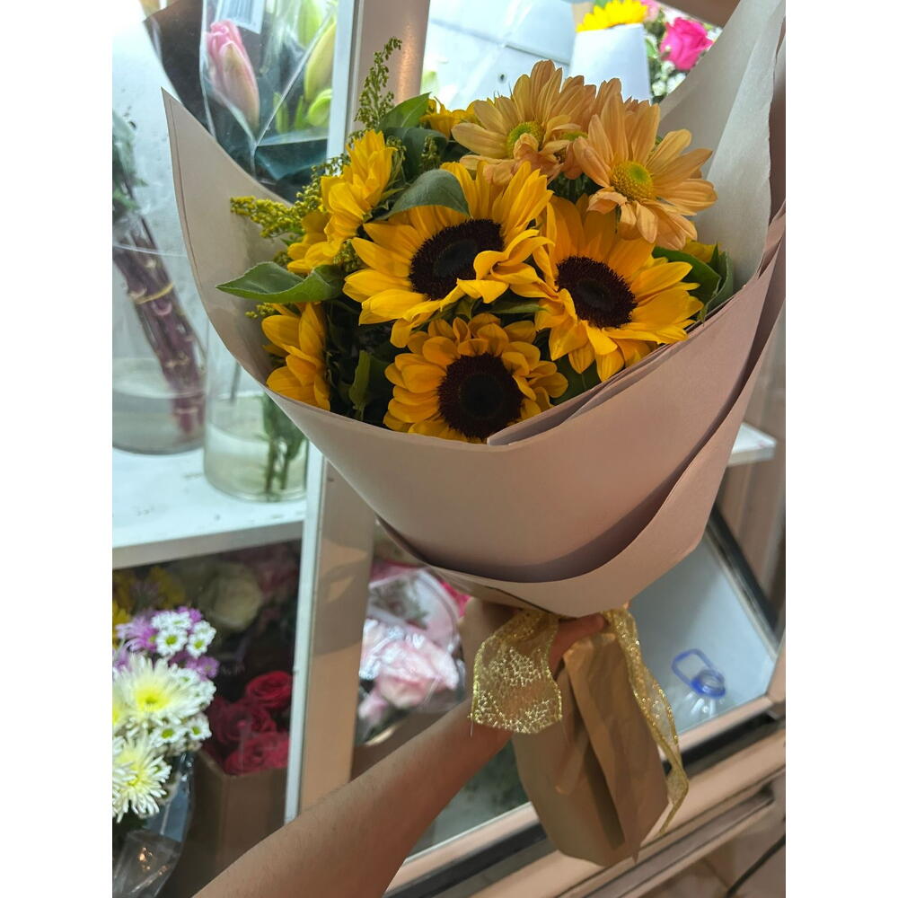 Este belo buquê é composto por 10 girassóis radiantes, habilmente arranjados com folhagens e complementos atraentes para realçar ainda mais sua beleza. Apresentado em uma embalagem luxuosa, é adornado com um laço dourado requintado, pronto para impressionar em qualquer ocasião. Este buquê possui um design que irradia alegria e positividade, perfeito para mostrar a alguém o quanto você se importa.