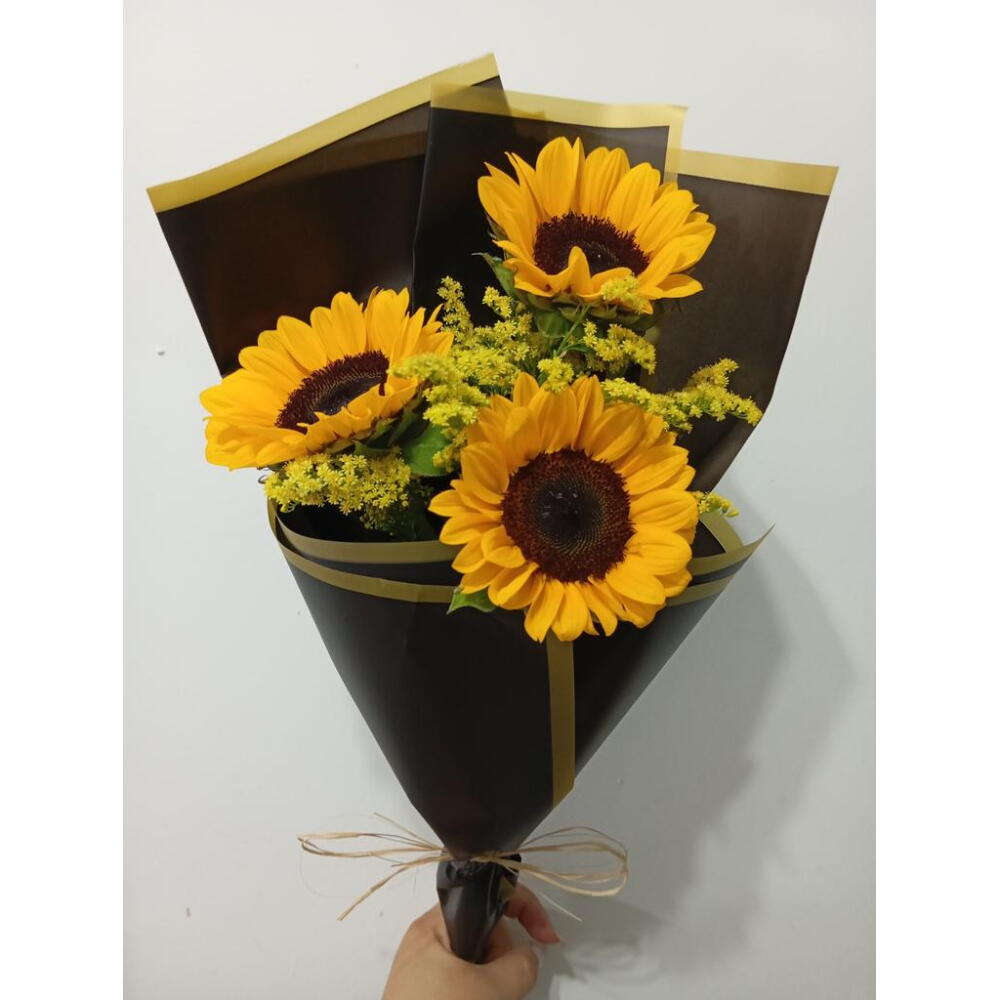 Este encantador buquê é feito com 3 vibrantes girassóis e um exótico Tango, uma espécie exuberante que adiciona um toque sofisticado. Complementado por uma unidade de folhagem para trazer um verde fresco ao conjunto, este buquê é cuidadosamente embalado em papel coreano e amarrado com um laço de ráfia para um acabamento rústico e elegante. Perfeito tanto para presentear como para acrescentar um toque de cor e vida ao seu espaço.