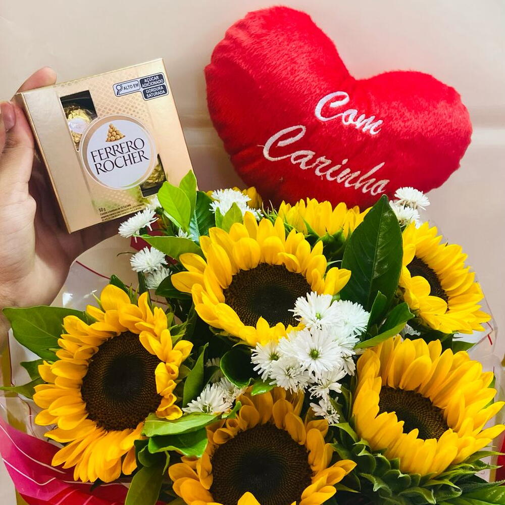 Buquê de Girassol+ Mini Coração de Pelucia e Ferrero Rocher