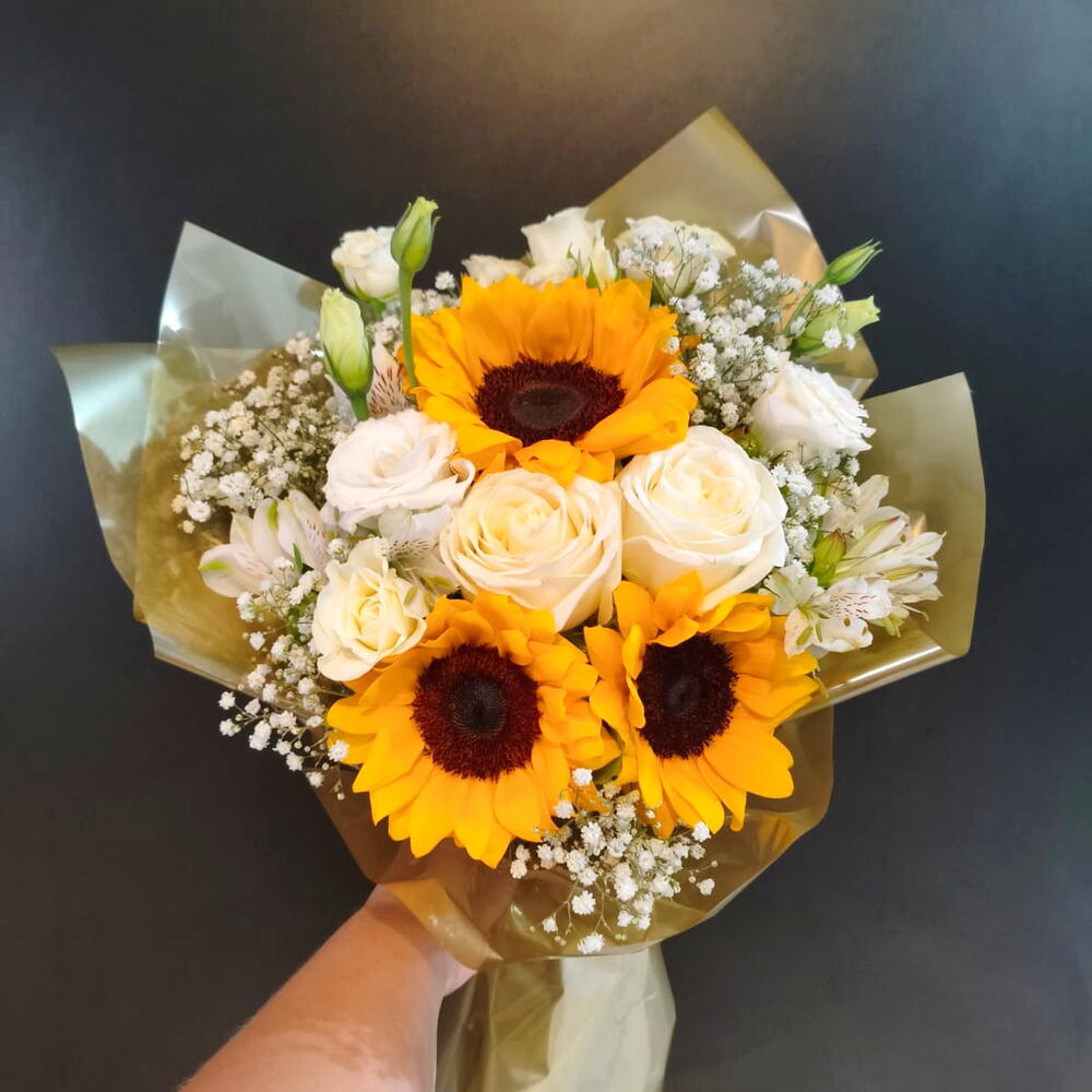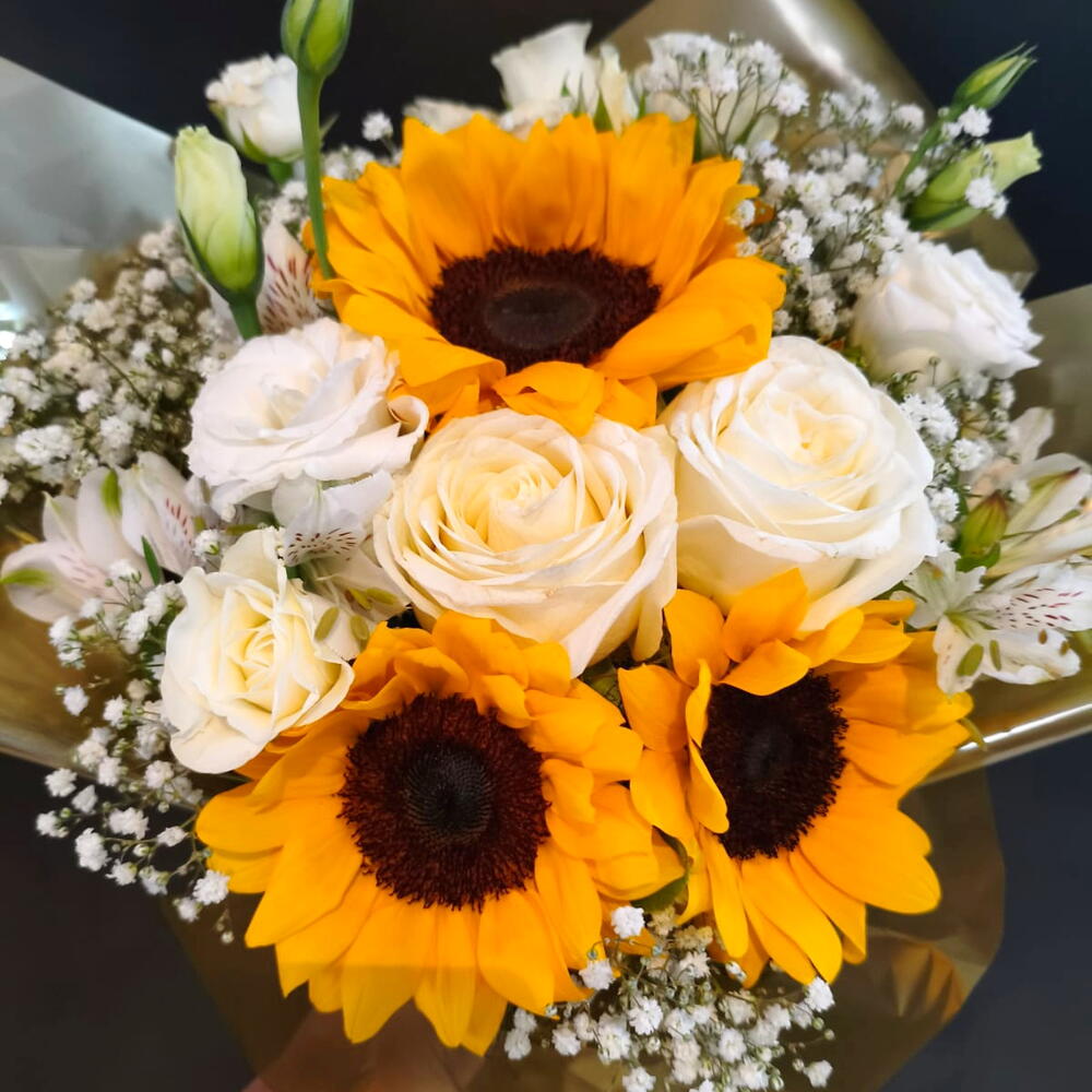 rosa branca - 2 un. girassol - 3 un. lisianthus branco - 3 un. folhagens verdes - 6 un. laço delicado - 1 un. gypisophila - 4 un. alstroémeria branca - 2 un. embalagem dourada ou kraft - 1 un.