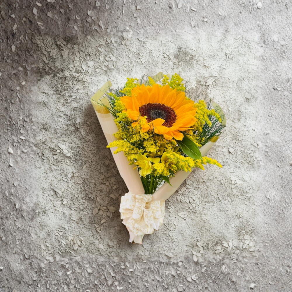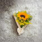 Buquê pequeno de 1 Girassol. Obs. Podem haver alterações na decoração do Buquê, porém a composição do mesmo segue firme a descrição.