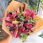 gypsophila - 1 un. eucaflor - 1 un. astroméria - 4 un. lírio rosa - 2 un. embalagem kraft e laço - 1 un.