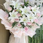 Composição sofisticada de lírios brancos exuberantes, combinados com delicadas rosas em tom rosé e toques sutis de gypsophila. O arranjo é envolto em papel especial em tom rosado suave, finalizado com laço de fita acetinada, criando um visual leve, romântico e atemporal. Ideal para presentear em momentos especiais como aniversários, celebrações, agradecimentos ou para transmitir carinho e elegância com simplicidade.