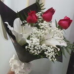rosa - 3 un. embalagem de designer - 1 un. folhagem - 3 un. egypsofila - 1 un. laço fita max - 1 un. lírio com 2 flores - 1 un.