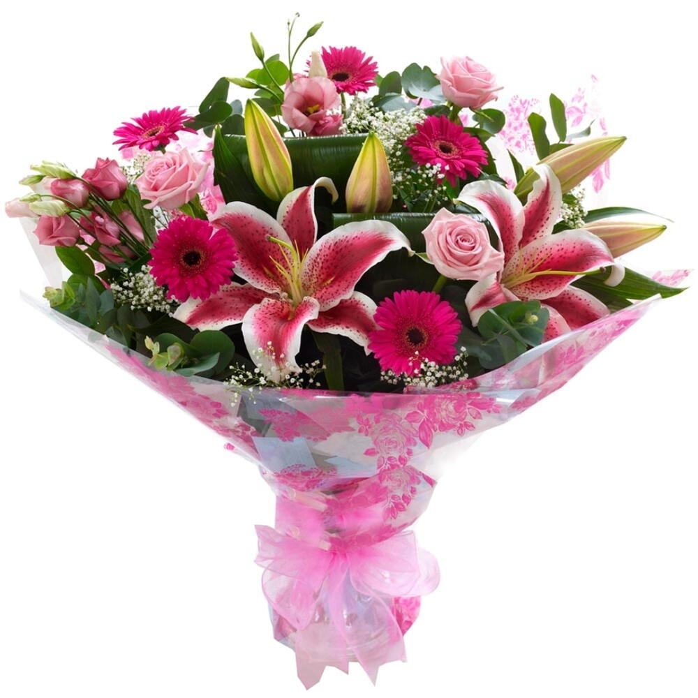 folhagem - 1 un. gérbera - 3 un. mosquitinhos - 1 un. rosa rosadas - 4 un. laço especial - 1 un. lírio rosados - 3 un. celofane embalagem - 1 un.