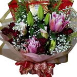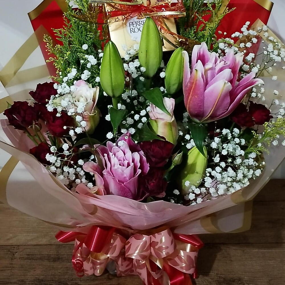 cartão de mensagem - 1 un. ferrero rocher 4un - 4 un. lírio rosa 2 galhos - 2 un. complemento (tango/gypsofila) - 4 un. rosa spray hastes - 3 un.