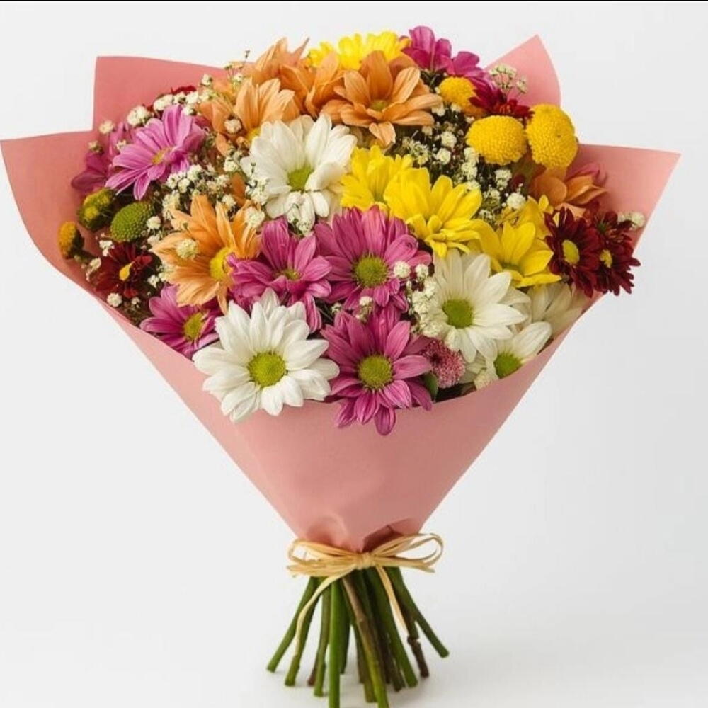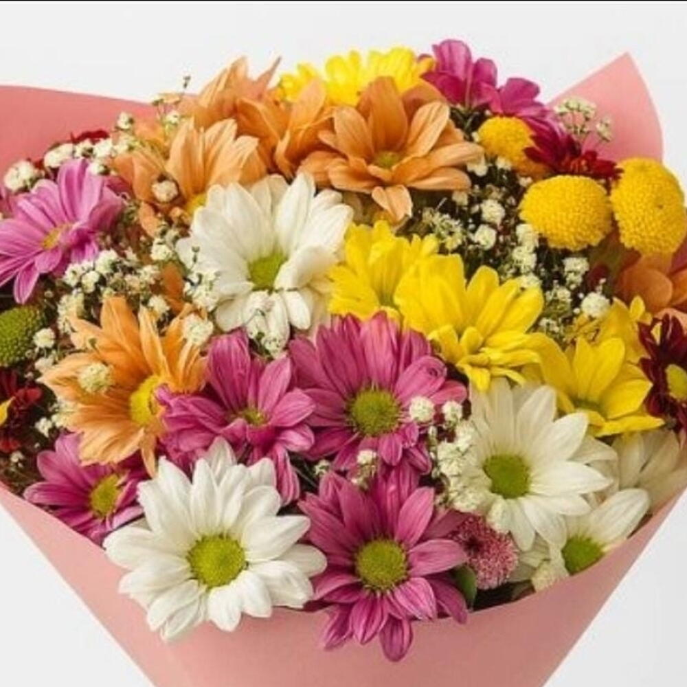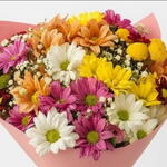 Este exuberante buquê é composto por Margaridas Coloridas, artisticamente arranjadas com Gypsophila, para um efeito verdadeiramente deslumbrante. Cuidadosamente embalado e concluído com um laço elegante, este buquê é a maneira perfeita de mostrar o seu amor e apreço. Seja para um aniversário, aniversário de casamento ou apenas porque, este buquê é garantido para encantar e inspirar admiração.