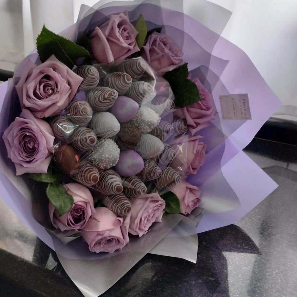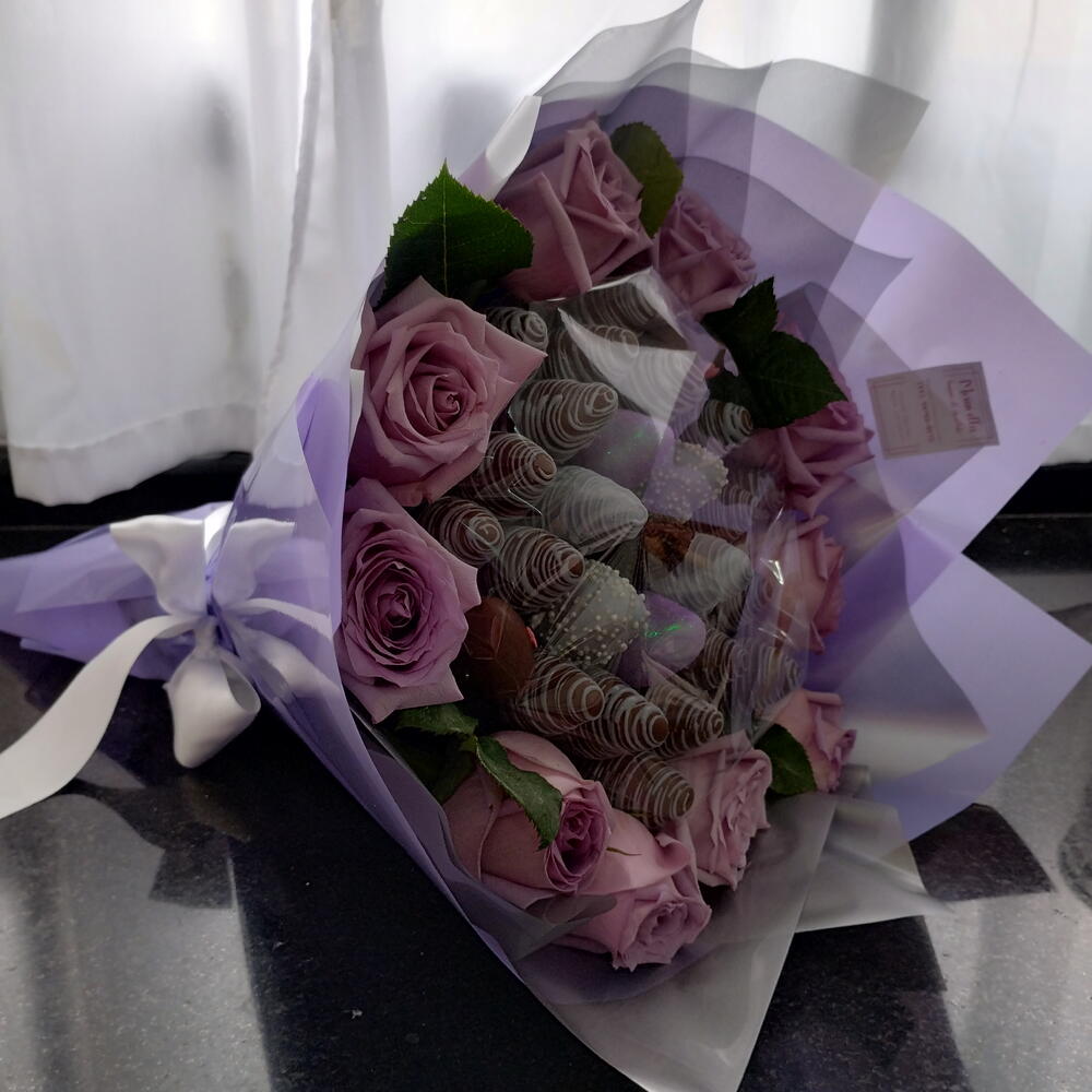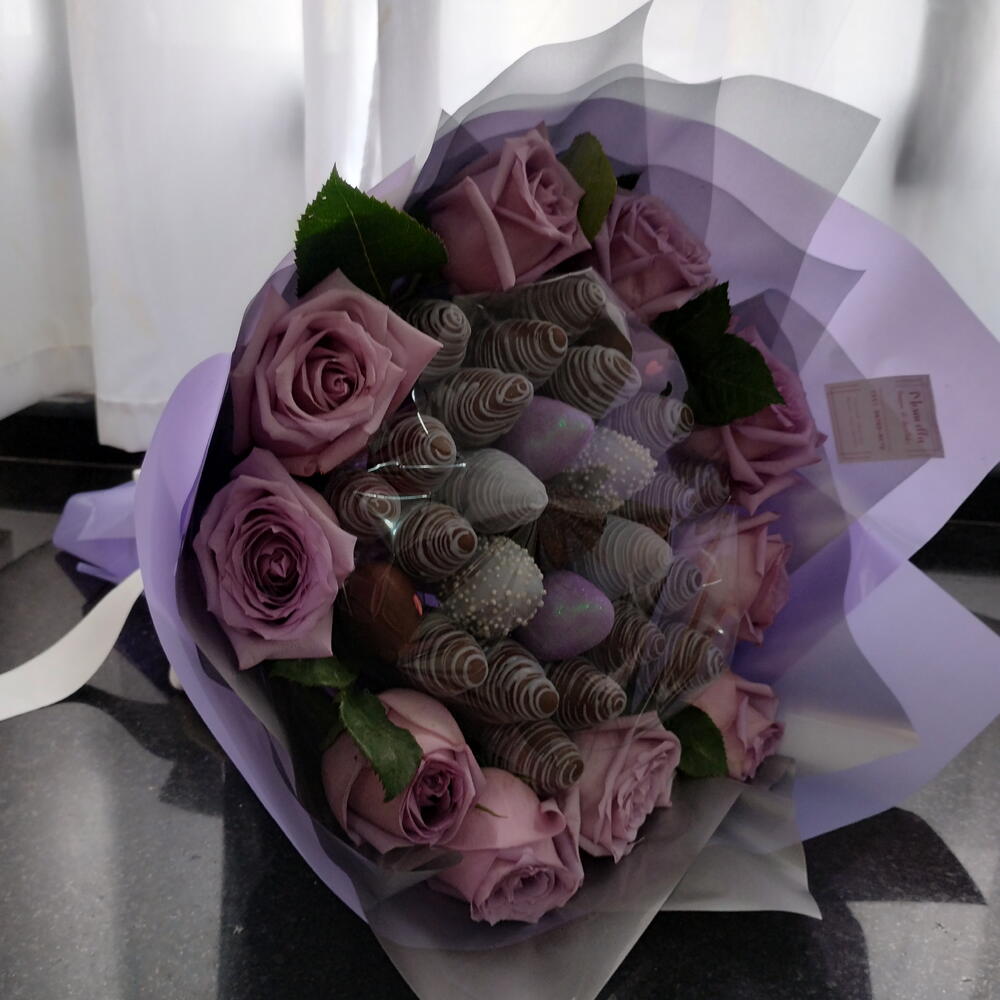 rosa - 10 un. embalagem - 2 un. folhagens - 3 un. laço - 1 un. morangos com cobertura - 30 un.