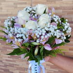 rosa brancas - 4 un. fita cetim branca - 1 un. astromelias aster ou ghipso - 1 un.
