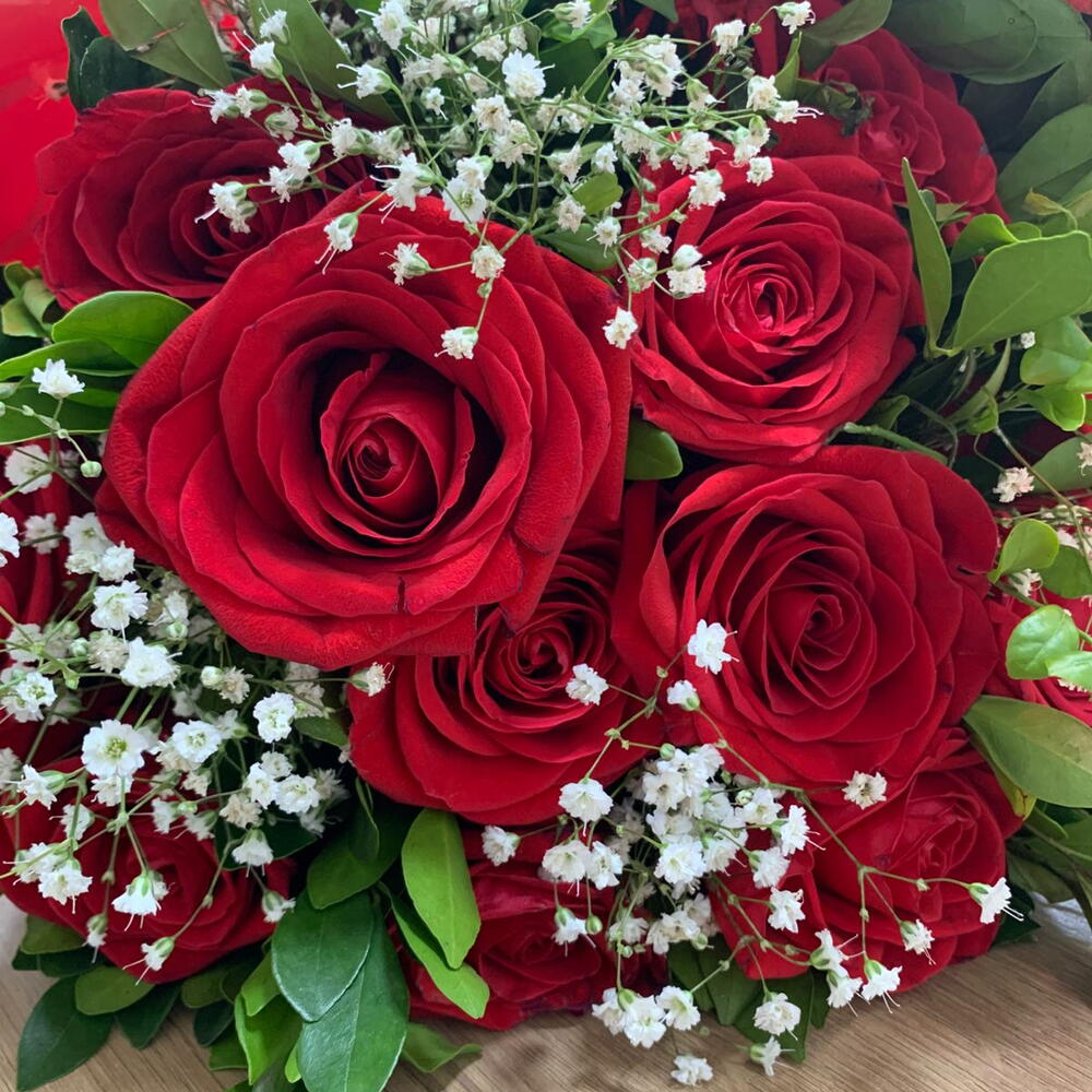 rosa - 12 un. embalagem - 1 un. folhagem - 10 un. laço - 1 un. gipsofila - 5 un.