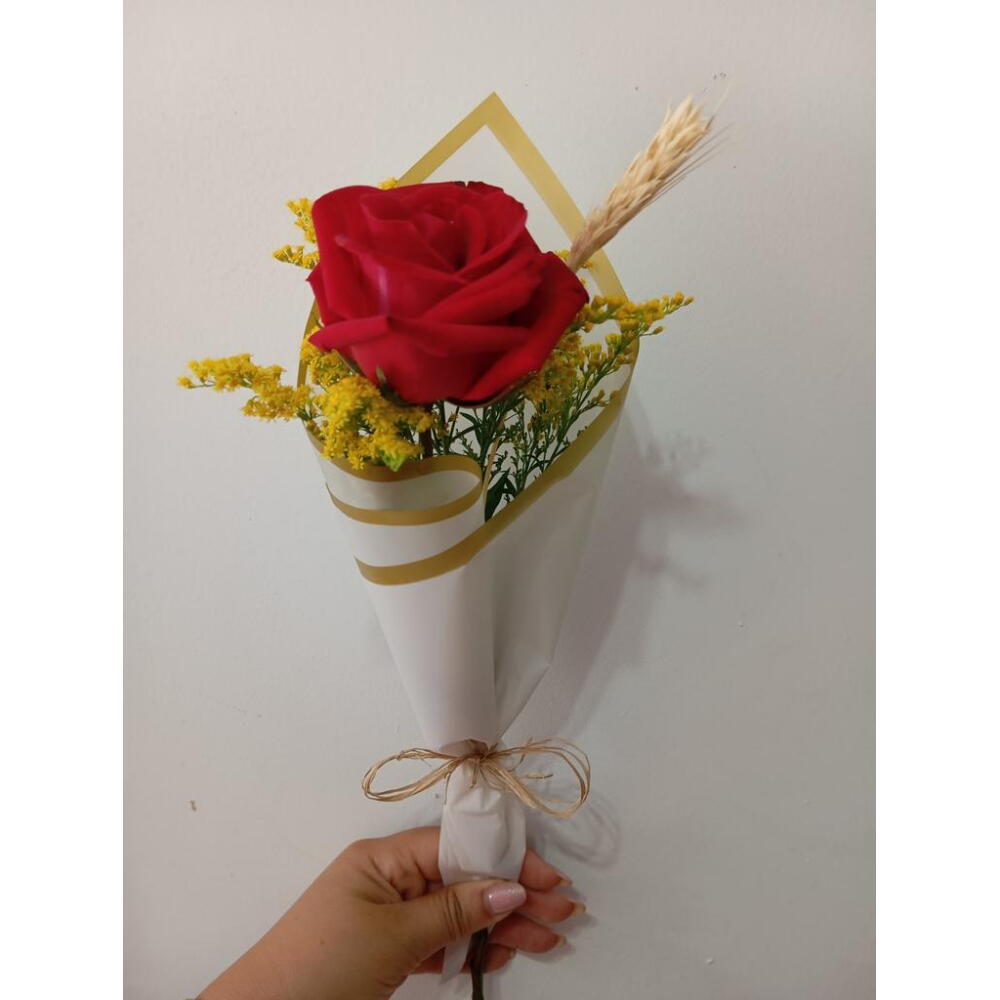 Este buquê fascinante é composto por uma rosa vermelha elegante, entrelaçada com um Tango requintado e uma seleção delicada de folhagens. Complementado por um ramo primoroso de trigo, conferindo um toque de nostalgia e simplicidade. Todos os componentes estão lindamente acondicionados em um papel coreano de alta qualidade que acentua a sua sofisticação. Para terminar com uma perfeição, um laço de cetim é cuidadosamente amarrado, proporcionando um visual deslumbrante e cativante. Este buquê é a representação perfeita do amor e carinho em forma de flor.
