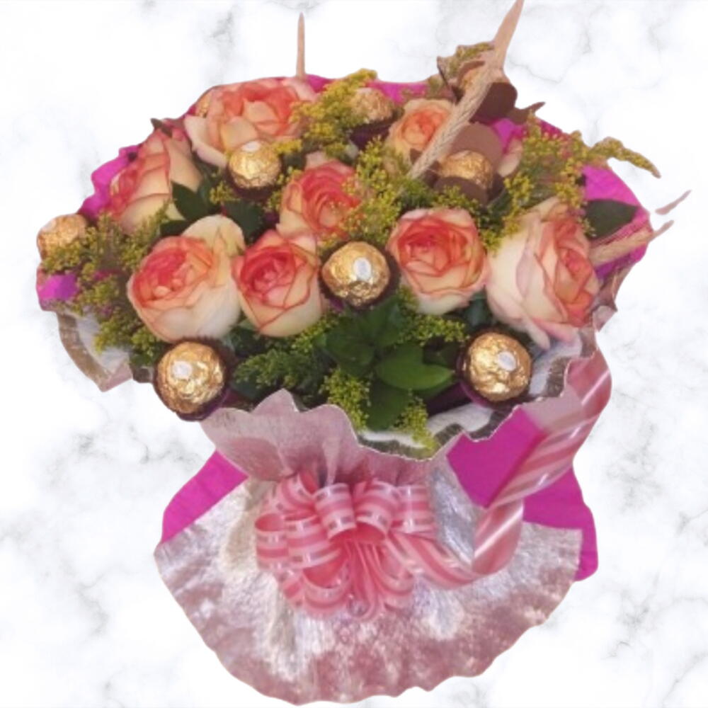 Este buquê charmoso apresenta 10 Rosas Ambiance e 8 bombons Ferrero Rocher, meticulosamente selecionadas para obter o máximo de beleza e elegância.