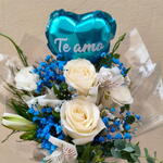 rosa branca - 2 un. embalagem transparente - 1 un. gypisophila azul - 4 un. laço de cetim azul - 1 un. folhagem e eucalipto - 2 un. alstroémeria branca - 2 un. balão personalizado de coração azul - 1 un.