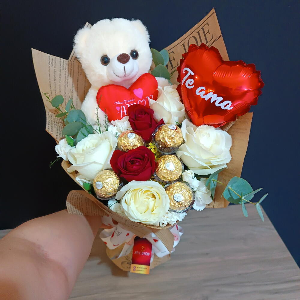 Declaração dos Sonhos Um buquê que nasce dos sentimentos mais profundos do coração. As rosas vermelhas revelam a intensidade de um amor vivido com paixão, enquanto as rosas brancas traduzem a pureza, a verdade e a paz de um sentimento sincero. O urso de pelúcia simboliza o abraço que conforta, protege e permanece, mesmo quando as palavras silenciam. Os chocolates Ferrero Rocher adoçam a entrega, lembrando que o amor também é cuidado, carinho e pequenos gestos diários. Para completar, o balão em formato de coração eleva essa composição como uma promessa de amor sonhado, desejado e vivido. Um presente marcante, feito para transformar emoções em lembranças eternas.