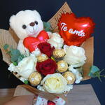 rosa vermelha - 2 un. rosa branca - 4 un. folhagens verdes - 5 un. bombom ferrero rocher - 5 un. ursinho de pelúcia 18cm - 1 un. gypisophila - 5 un. laço romântico - 1 un. embalagem kraft journal - 1 un. balão pequeno de coração vermelho personalizado - 1 un.