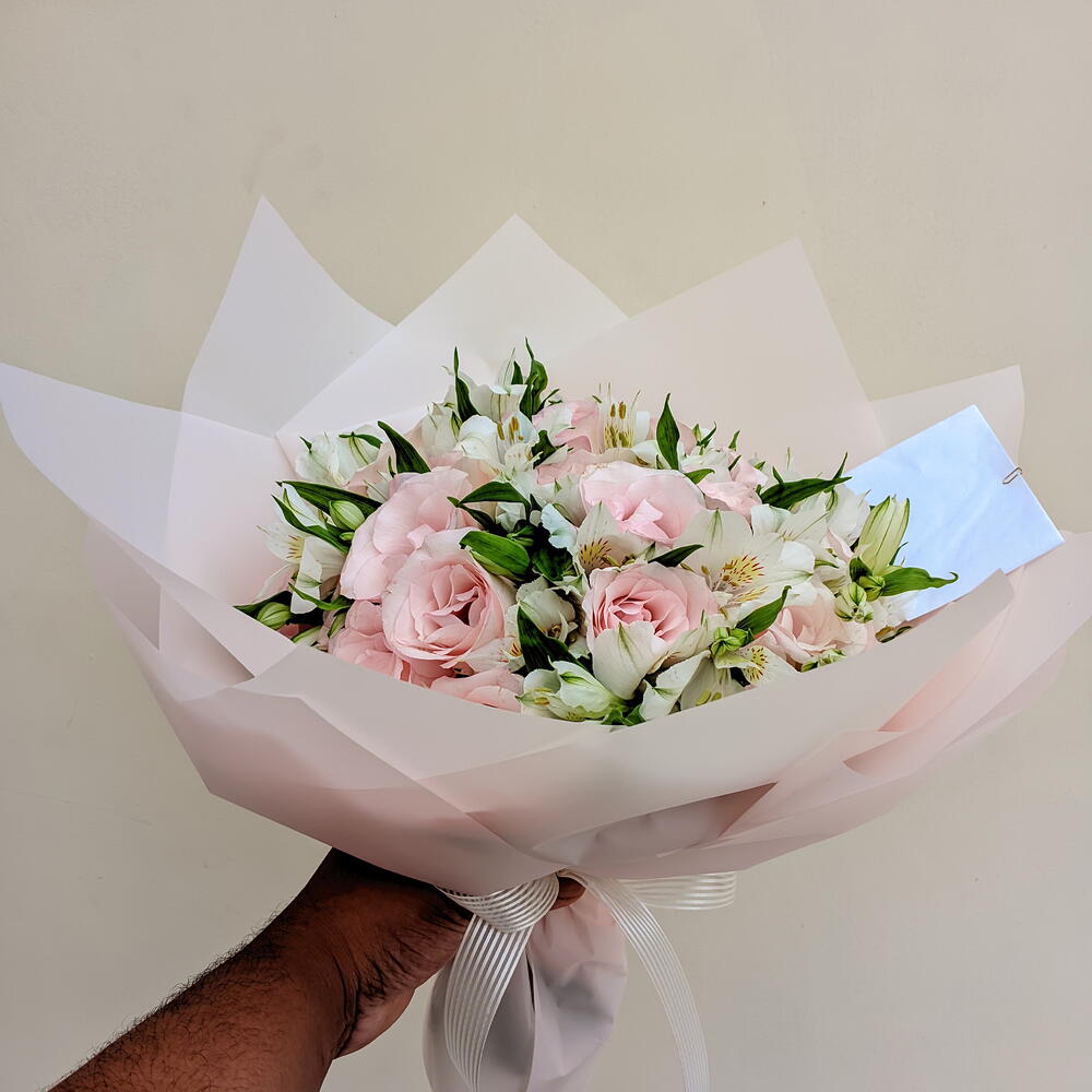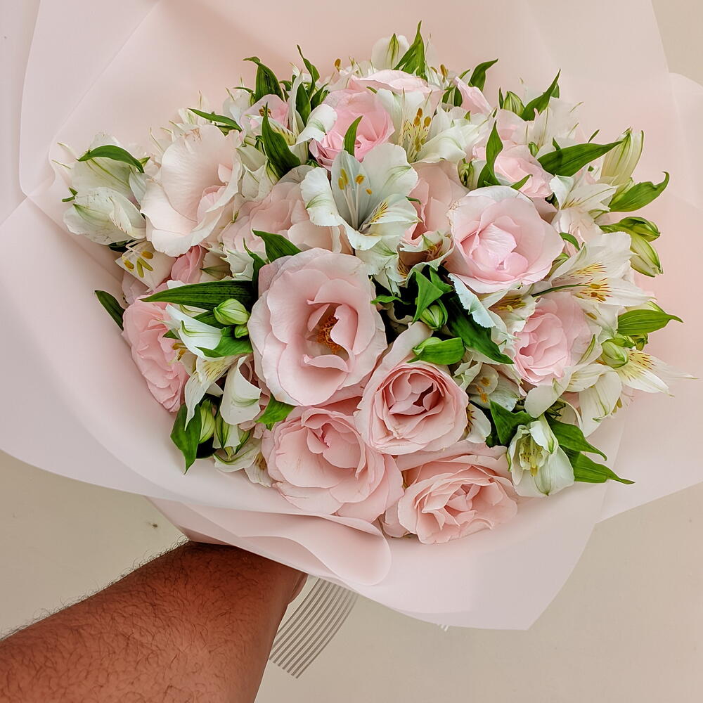 Este deslumbrante buquê é uma composição arrebatadora de flores frescas e vibrantes. Com um total de 10 unidades de astromelias brancas que simbolizam a pureza e a paz, complementadas por 24 rosas cor-de-rosa que expressam admiração e agradecimento, este arranjo é uma declaração de emoção que fala mais alto do que palavras. Cuidadosamente embalado numa elegante embalagem de designer e decorado com um laço para dar um toque final, este buquê é um presente perfeito para qualquer ocasião.