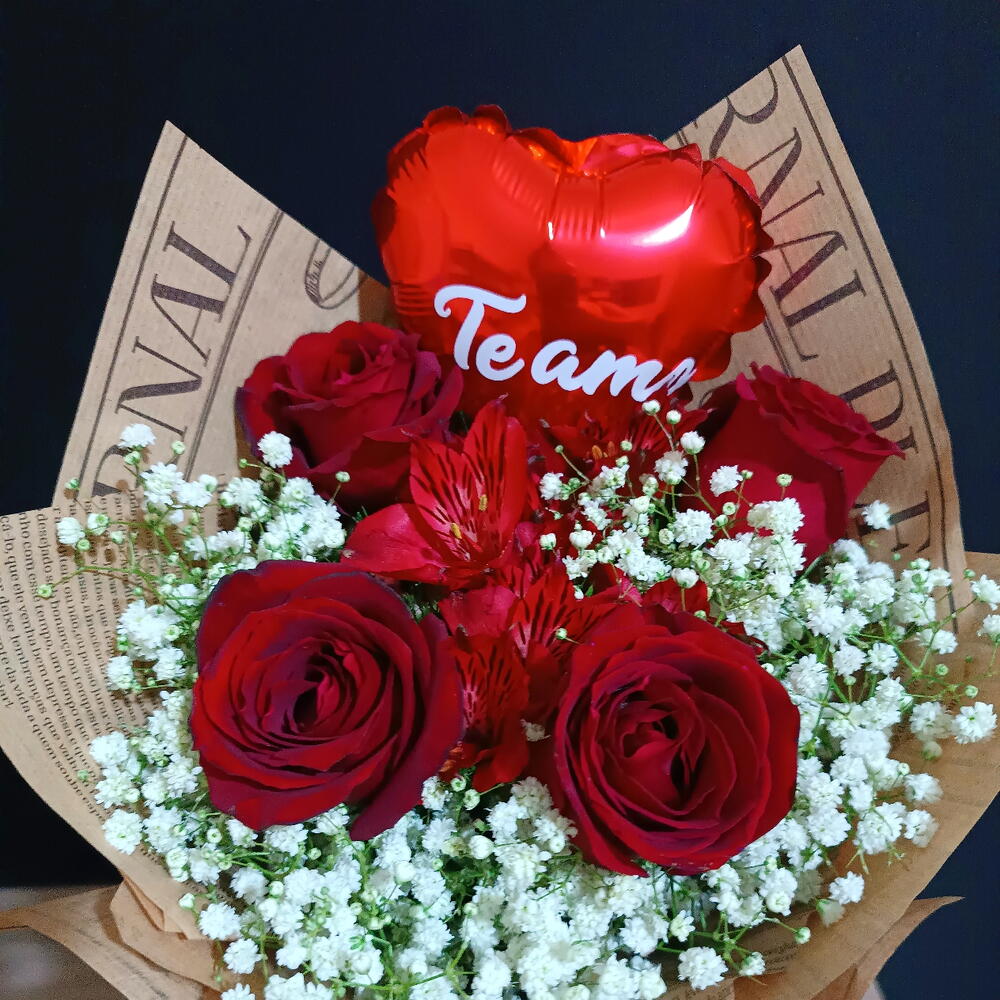 Buquê Coração Apaixonado Um verdadeiro símbolo do amor intenso. Composto por rosas vermelhas exuberantes, que representam a paixão e o desejo, envolvidas pela delicadeza da gypisophila, trazendo leveza e romantismo ao arranjo. Para completar, o balão em formato de coração com a mensagem “Te Amo” transforma o buquê em uma declaração inesquecível, perfeita para dizer tudo aquilo que o coração sente.