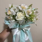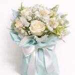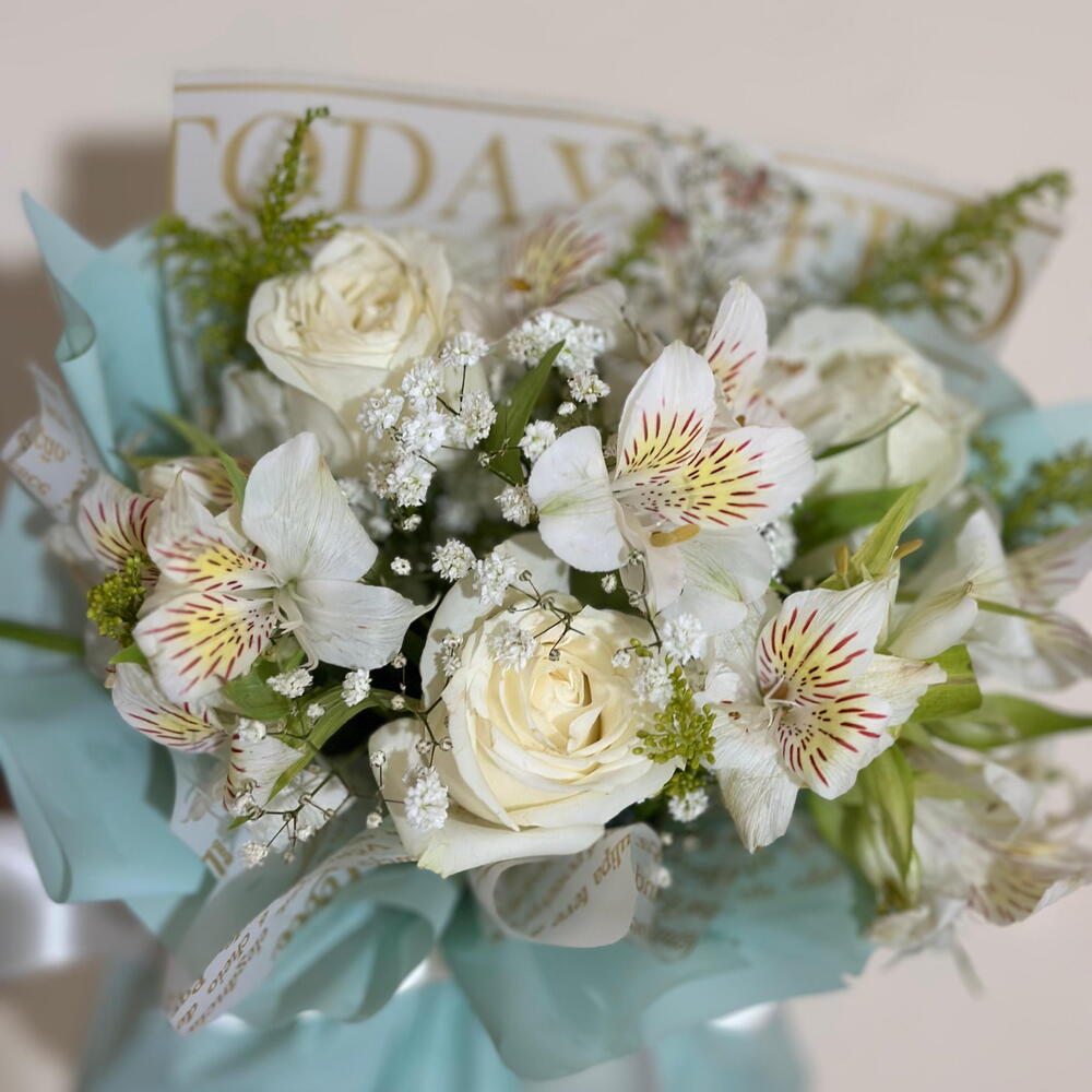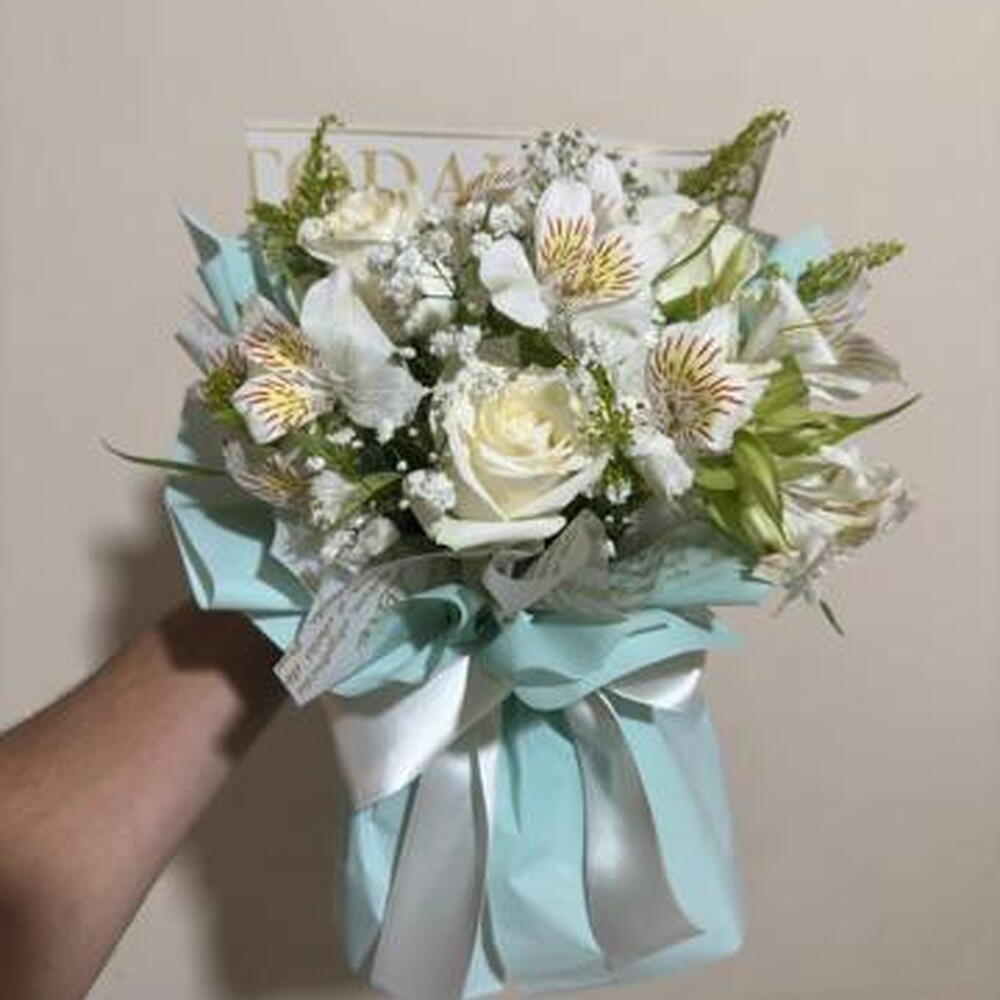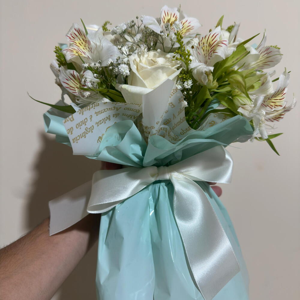 Um buquê sofisticado e cheio de delicadeza, composto por rosas brancas frescas, astromélias brancas com detalhes suaves, mosquitinho e folhagens naturais, criando um arranjo leve e harmonioso. A composição é finalizada com embalagem azul suave e laço de cetim branco, trazendo um toque elegante e moderno. Perfeito para presentear em aniversários, agradecimentos, gestos de carinho ou momentos especiais.