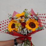Este encantador buquê composto por 3 unidades de girassol vibrante, 3 unidades de elegantes rosas vermelhas, 8 unidades de folhagem verde complementada por delicadas gipsofilas, promete roubar o coração à primeira vista. Cuidadosamente embalado e finalizado com um laço, este buquê é a escolha perfeita para quem busca transmitir sentimentos de amor, admiração e respeito.