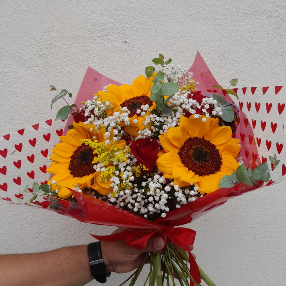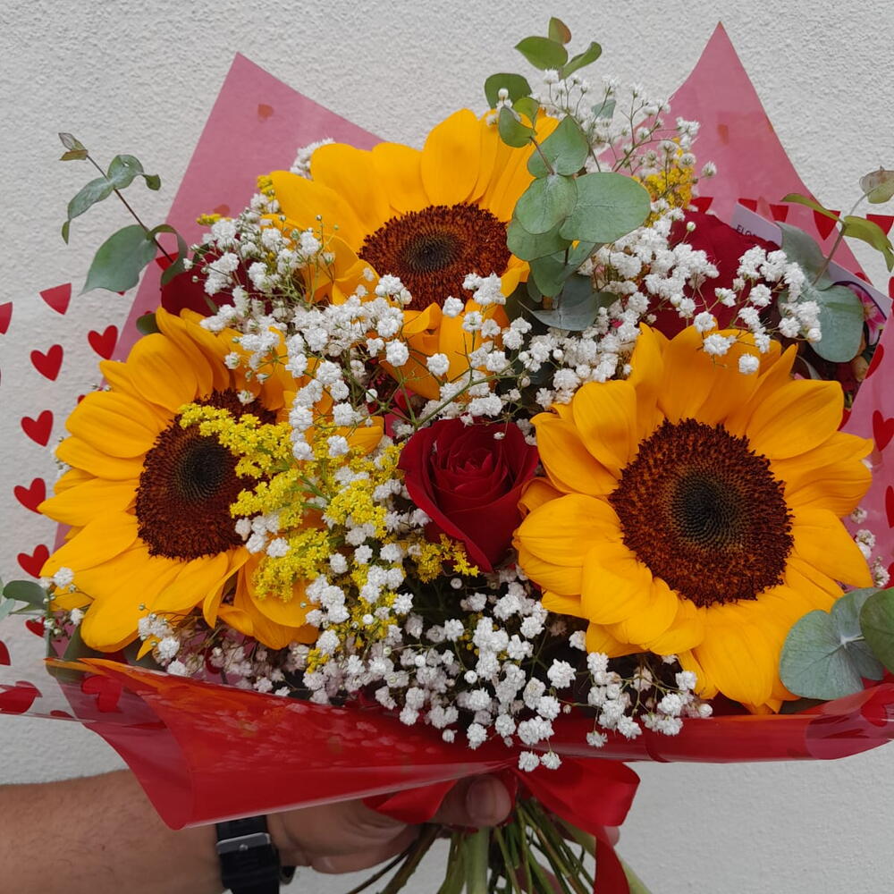 Este encantador buquê composto por 3 unidades de girassol vibrante, 3 unidades de elegantes rosas vermelhas, 8 unidades de folhagem verde complementada por delicadas gipsofilas, promete roubar o coração à primeira vista. Cuidadosamente embalado e finalizado com um laço, este buquê é a escolha perfeita para quem busca transmitir sentimentos de amor, admiração e respeito.