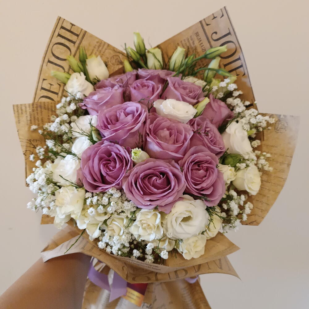 lisianthus branco - 8 un. folhagens verdes - 10 un. rosa lilás - 12 un. mini rosa branca - 8 un. gypisophila - 10 un. embalagem kraft journal - 1 un. laço cetim lilás - 1 un.
