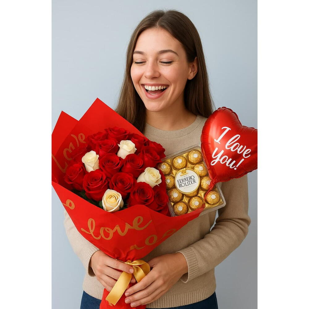 rosa brancas - 5 un. rosa vermelhas - 45 un. balão de coração - 1 un. caixa de ferrero - 1 un. embalagem especial conforme disponibilidade - 1 un.