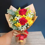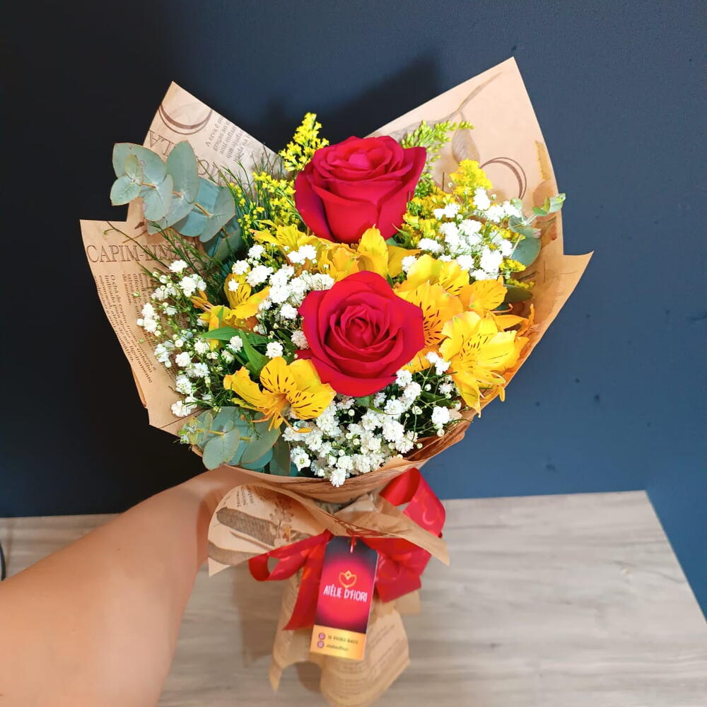 rosa vermelha - 2 un. gypisophila - 2 un. laço romântico - 1 un. embalagem kraft journal - 1 un. alstroémeria amarela - 2 un. folhagens verdes e tango amarelo - 5 un.