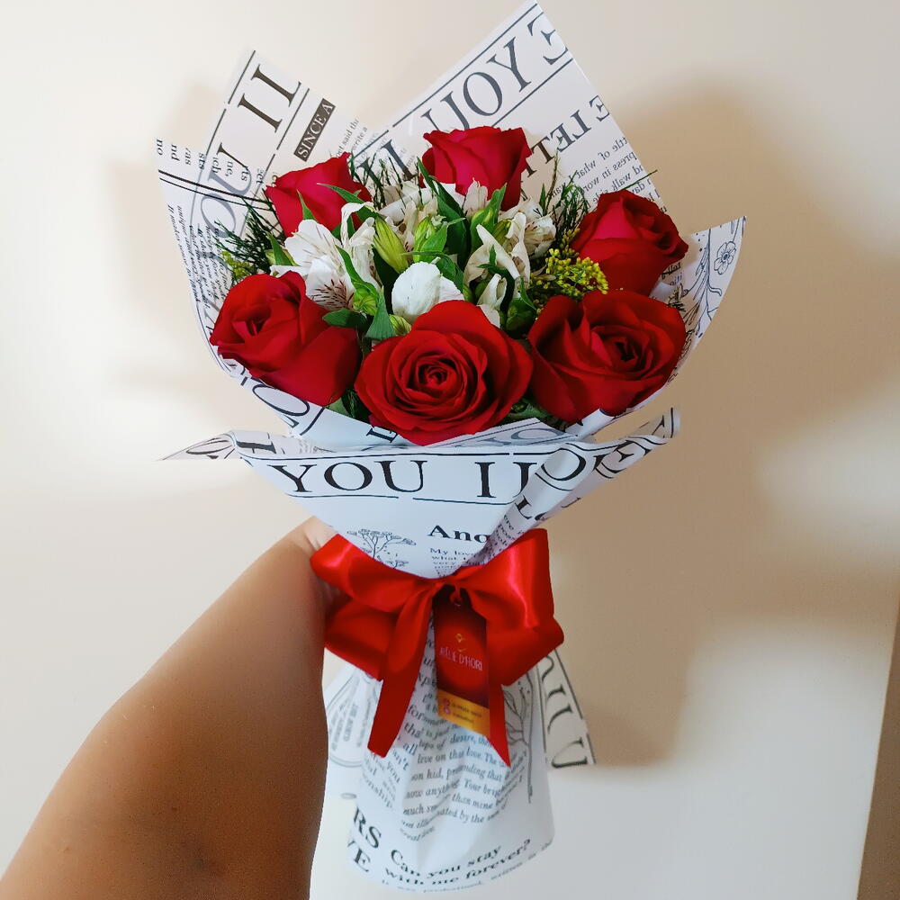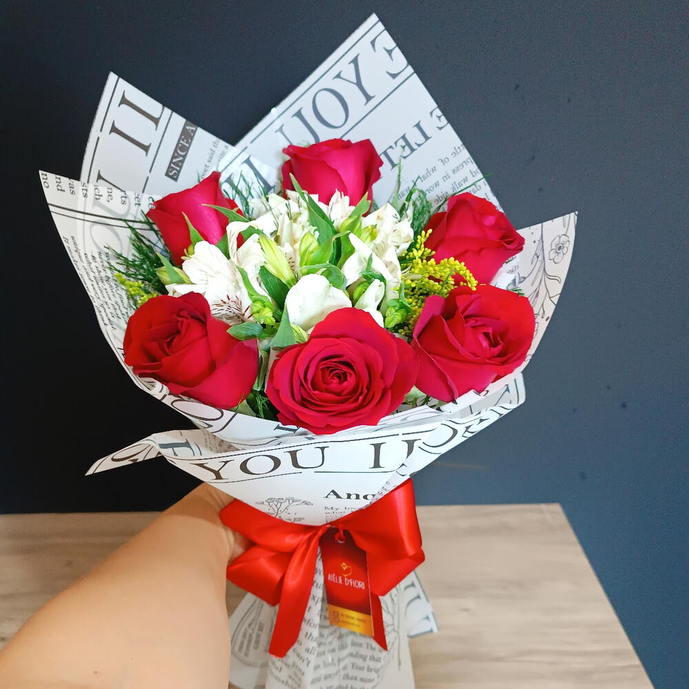 rosa vermelha - 6 un. laço de cetim vermelho - 1 un. alstroémeria branca - 3 un. folhagens verdes e tango amarelo - 6 un. embalagem poli acetinado jornal branco e preto - 1 un.