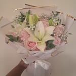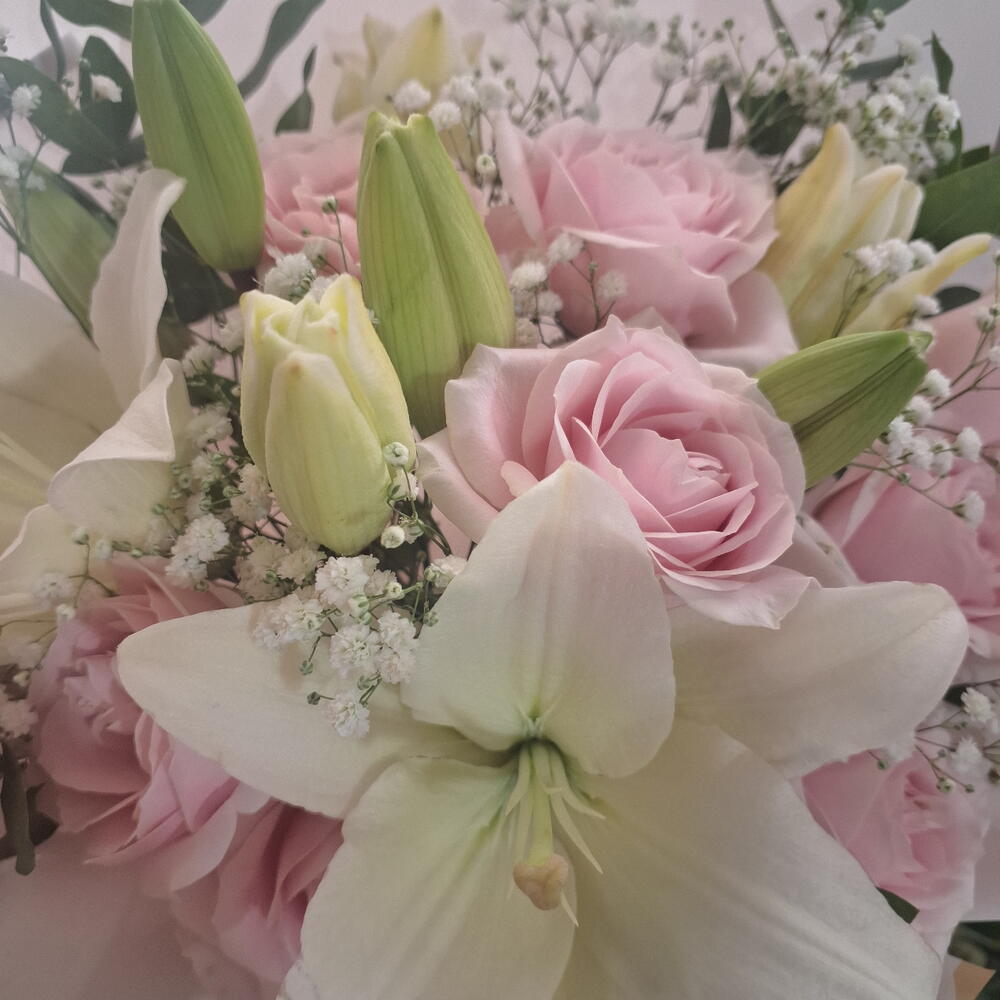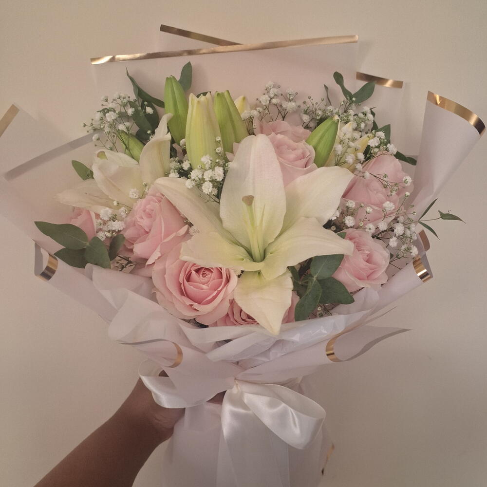 Lindo buquê de rosas e lírios feito na espuma floral, ideal para presentear em datas comemorativas como aniversários e datas especiais.
